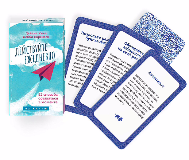 Колода "Действуйте ежедневно" познакомит вас с основными тезисами терапии принятия и ответственности (ТПО). Каждая карта описывает разные навыки, например внимательность, принятие или сострадание к себе. Это не сложно и не требует специального места и времени для практики. С помощью карт вы сможете поддержать себя в тот самый момент, когда нахлынут тревога и сомнения, вы перестанете верить в свои силы, вас одолеет прокрастинация. Вы научитесь справляться с трудностями и присутствовать в настоящем моменте, не тревожась о прошлом или будущем. Самое главное, вы узнаете, как действовать, опираясь на собственные ценности, стать более устойчивыми и в то же время гибкими. А значит, сможете двигаться вперед.