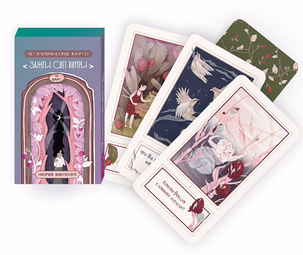 Метафорические карты «Зажги свет внутри» подарят вам ощущение уюта и спокойствия. Уникальные иллюстрации российской художницы Марии Финченко имеют метафорический подтекст и наполнены глубоким символизмом, что сделает процесс самопознания вдохновляющим и трансформирующим. Когда вы будете рассматривать детали на каждом рисунке, вы погрузитесь в волшебный и безопасный мир, в котором можно спокойно исследовать себя и свои границы.