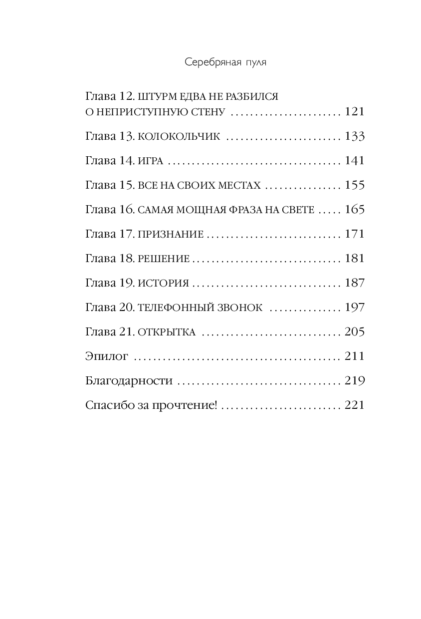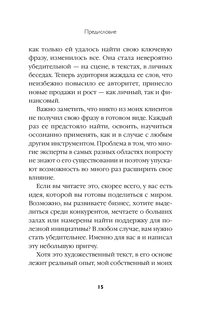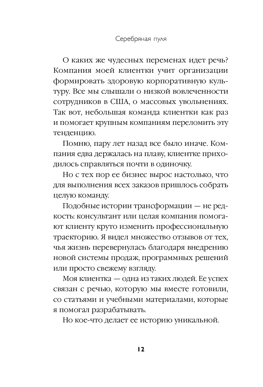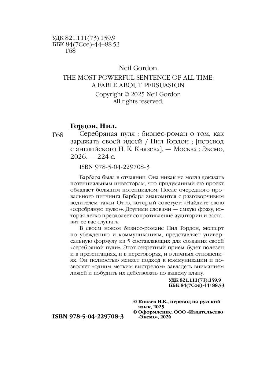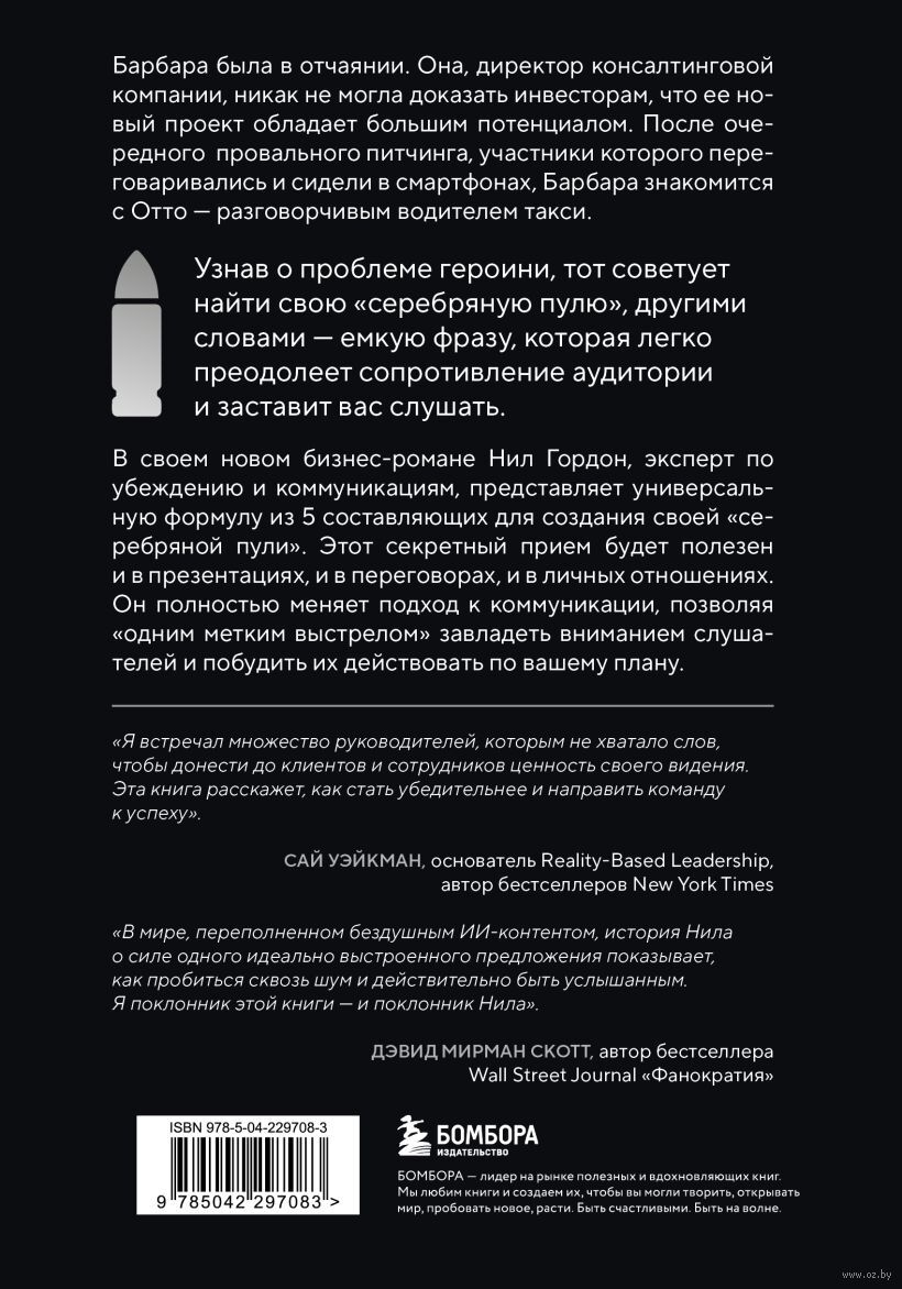 В своем новом бизнес-романе Нил Гордон, эксперт по убеждению и коммуникациям, представляет универсальную формулу из 5 составляющих для создания своей "серебряной пули". Этот секретный прием будет полезен и в презентациях, и в переговорах, и в личных отношениях. Он полностью меняет подход к коммуникации и позволяет "одним метким выстрелом" завладеть вниманием людей и побудить их действовать по вашему плану.