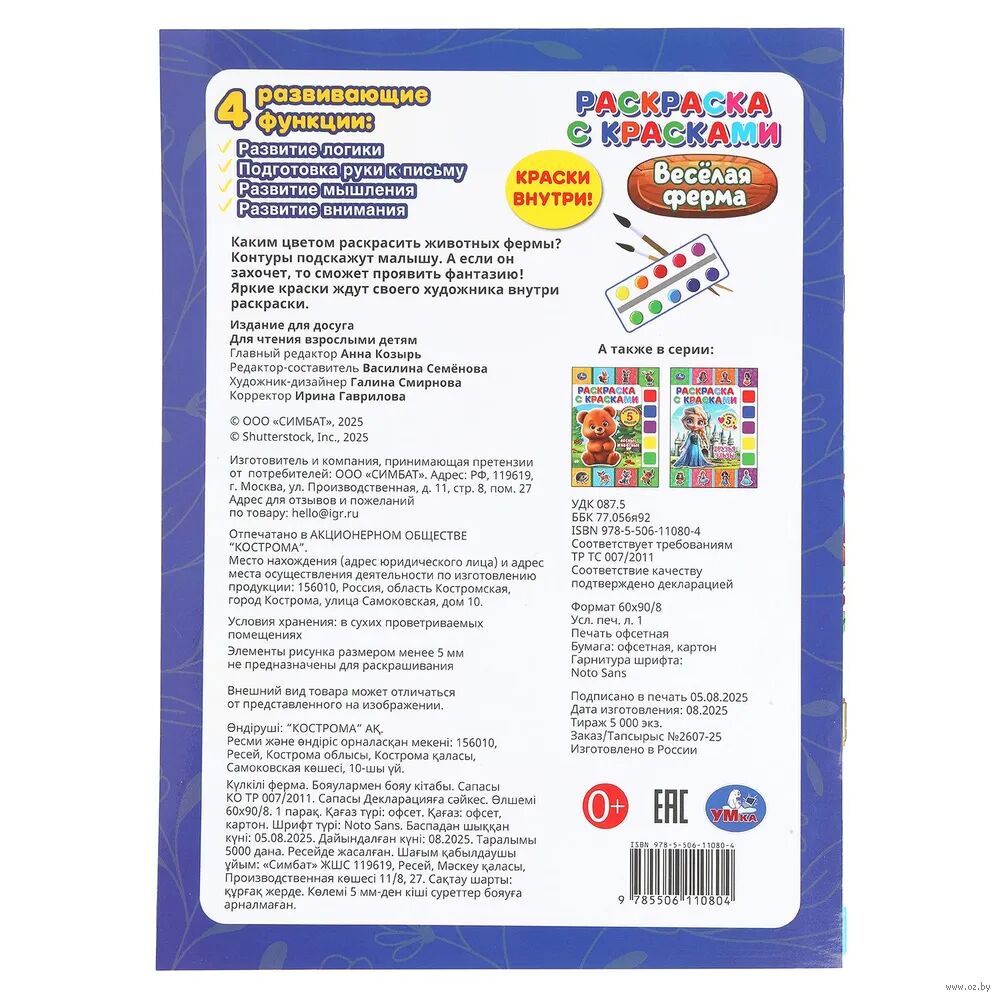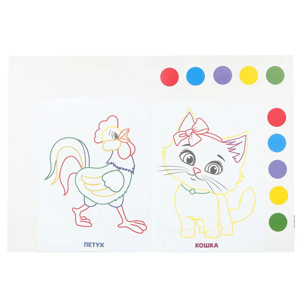 Теперь не нужно покупать краски и фломастеры – на последней странице этой замечательной раскраски есть настоящие акварельные краски. Это особенно удобно для спонтанных занятий творчеством: остаётся только коснуться красок мокрой кисточкой и вдохнуть жизнь в иллюстрации, цветной контур которых служит подсказкой, какой цвет выбрать. Стоит отметить, что раскраски с красками особенно полезны для детей младшего возраста, когда они только начинают знакомиться с художественными материалами и нуждаются в простом и понятном формате творчества.