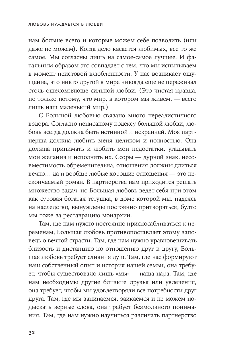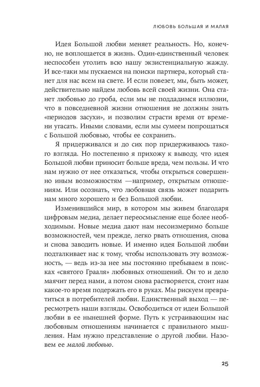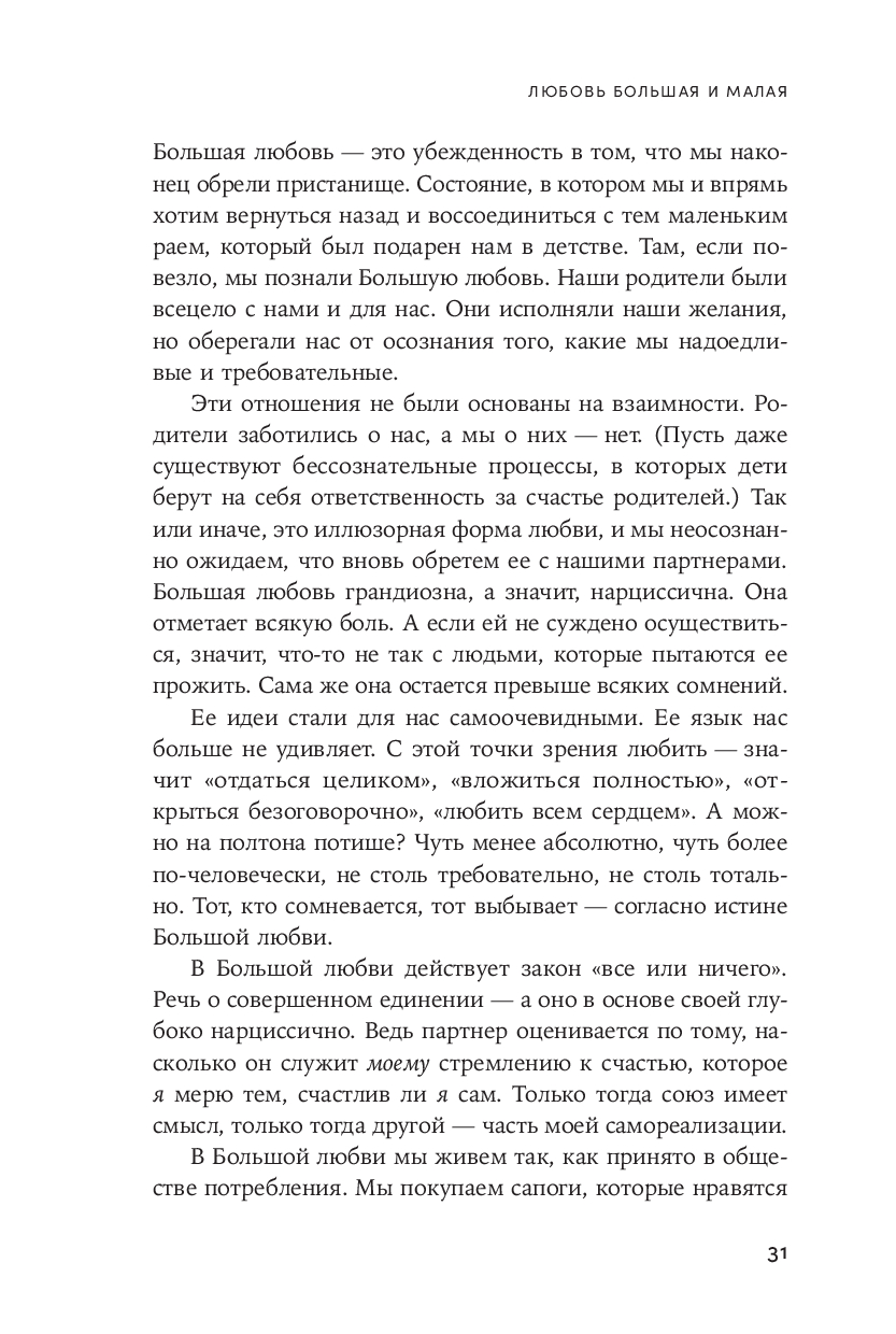 Квалифицированный психолог и семейный психотерапевт Оскар Хольцберг предлагает нам не жить ожиданием мифической Большой любви, вымещая неудовлетворенность от ее отсутствия на наших "недостаточно идеальных" партнерах, а сосредоточиться на доступной уже сейчас реальности.