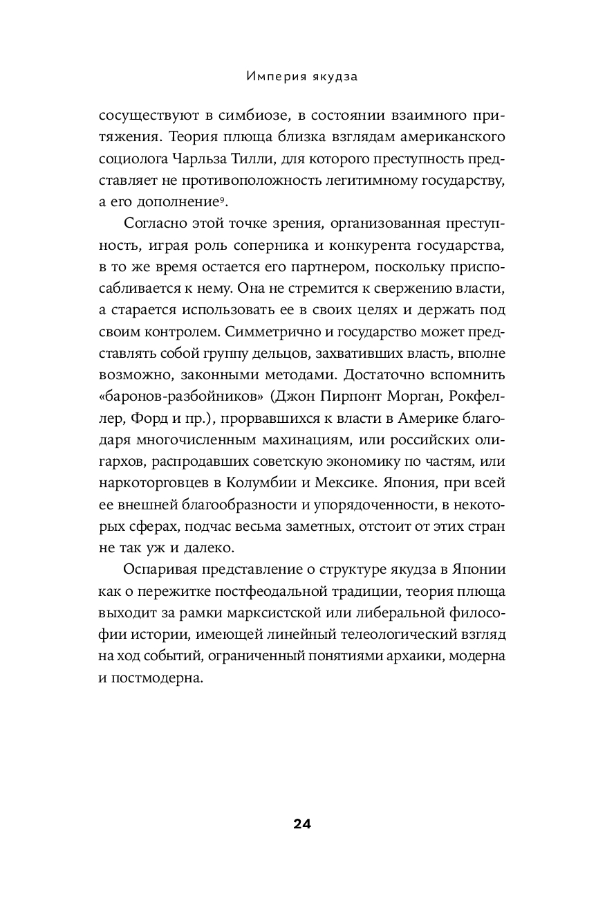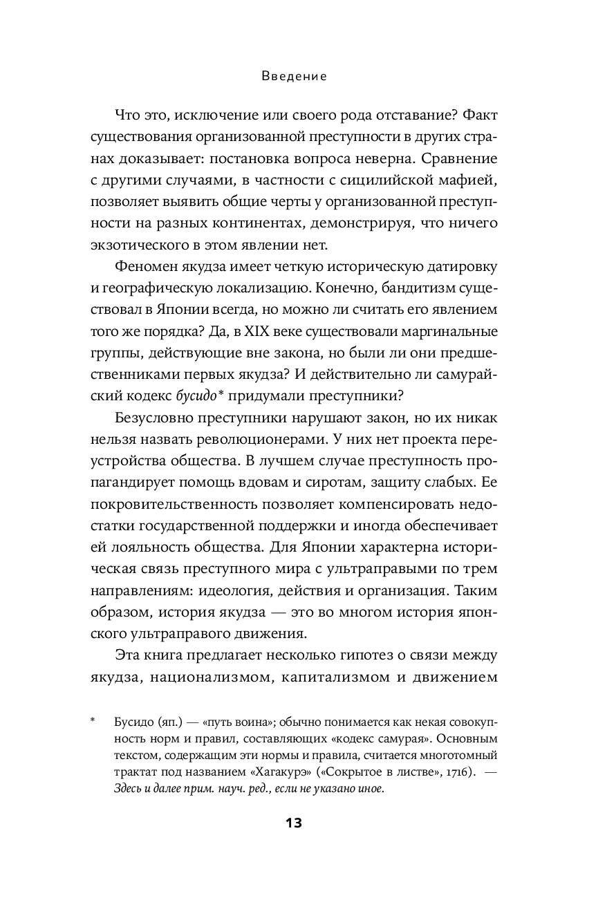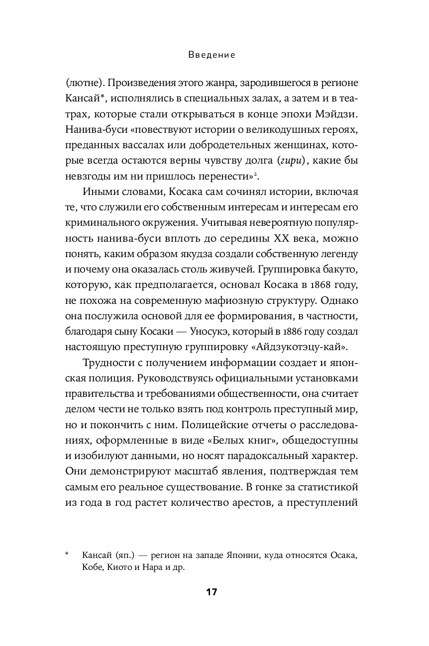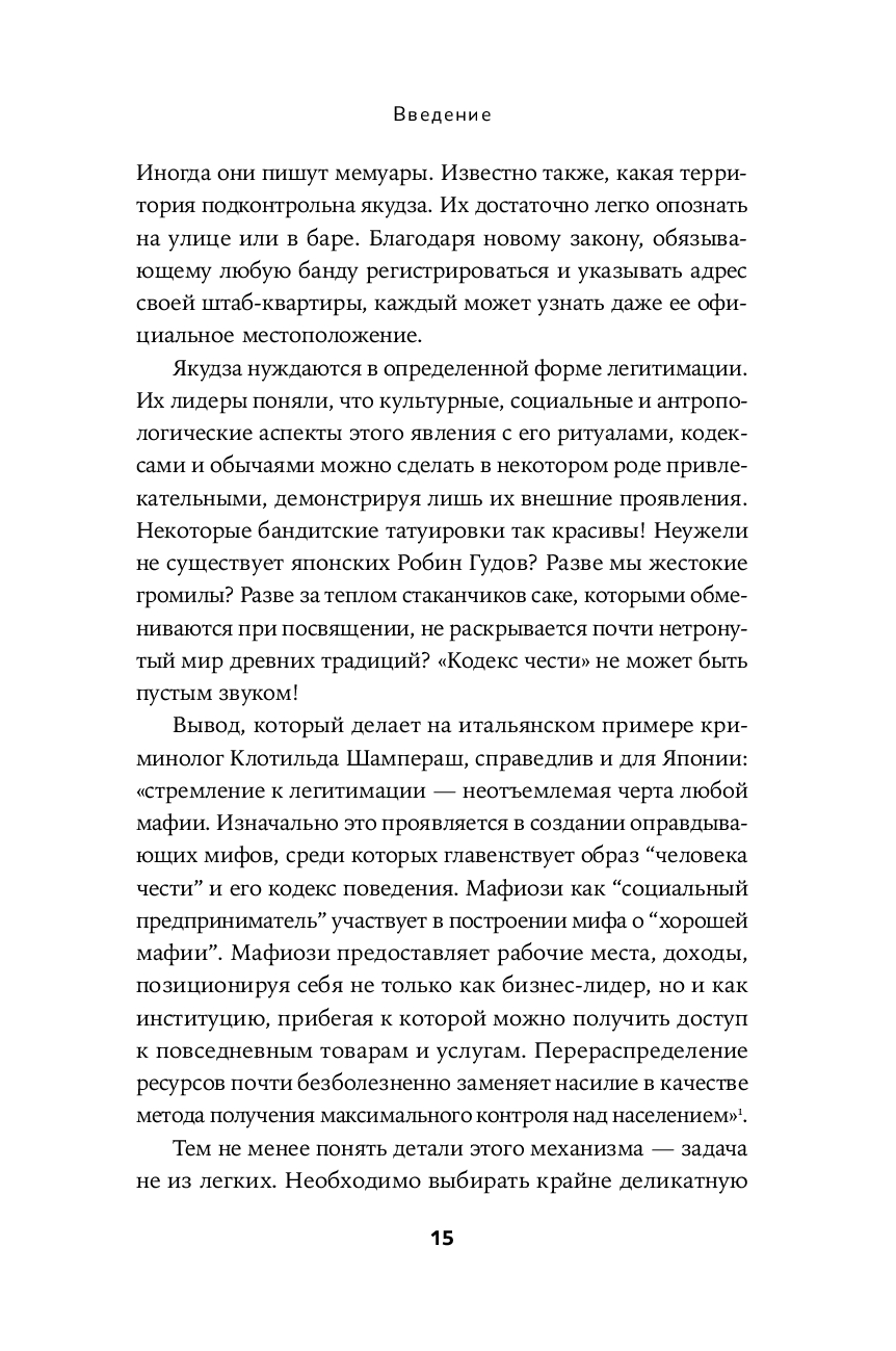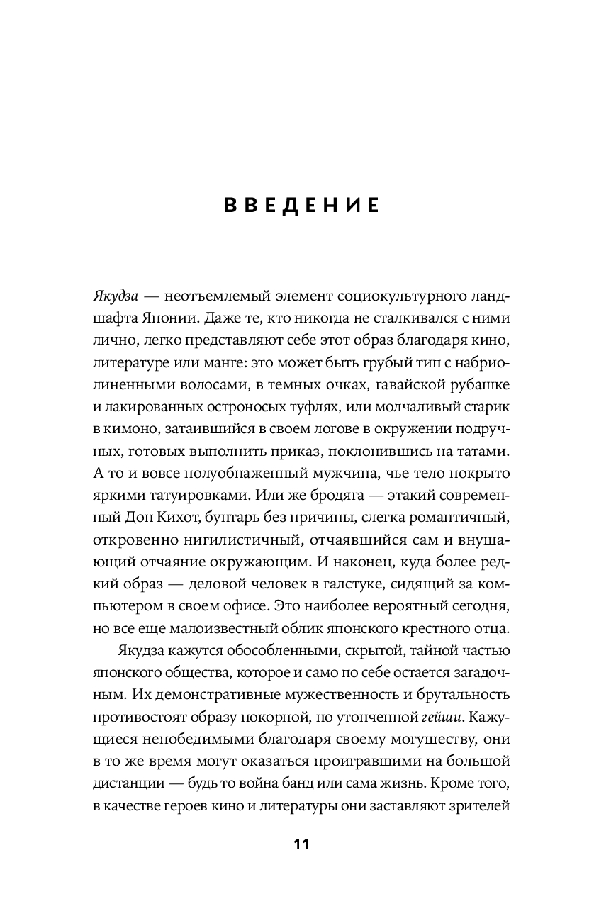 Подобно ниндзя и самураям, якудза стали одной из "визитных карточек" японской культуры и общества в глазах остального мира. Широко представленное в литературе и кино, это явление притягивает и в то же время заставляет задаться вопросом: как может такая архаичная и квазифеодальная структура сохраняться в демократической, промышленно развитой и технологичной Японии? Проводимое Пеллетье сравнение с преступными организациями других стран, особенно с сицилийской мафией, позволяет выявить общие черты, но также заметить и специфику японского преступного мира: его близость к крайне правым и в идеологии, и в функционировании. Западные исследователи давно и подробно описали деятельность якудза, их иерархию, ритуалы, культурные коды (татуировки, одежду и т.д.). Однако связь якудза с миром политики до сих пор не была детально изучена. Эту "неудобную" тему Пеллетье поднимает в своей книге, рассказывая и об истории, и о сегодняшнем дне организованной преступности в Японии.