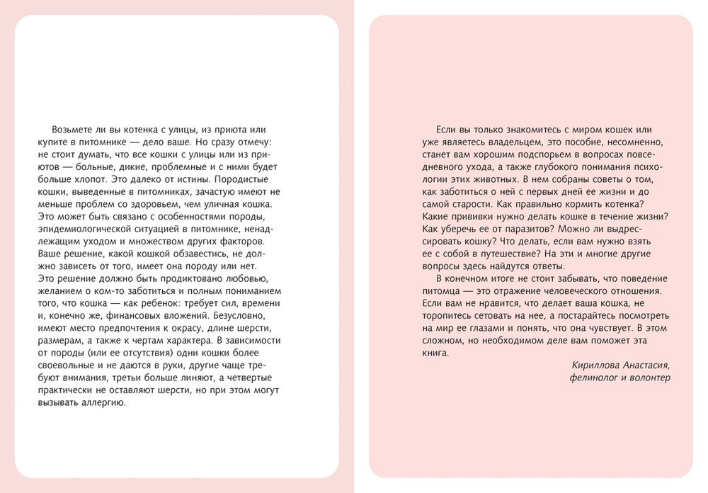 Здесь вы найдете необходимые рекомендации по выбору котенка, его адаптации к новому дому, знакомству с другими животными, составлению подходящего рациона, профилактике заболеваний, а также организации досуга и игр. Это заботливое пособие уделяет особое внимание психологическому взаимодействию с кошкой, пониманию ее сигналов и решению поведенческих проблем. А в качестве приятного бонуса вы сможете узнать, как выводились самые известные и уникальные породы в мире!