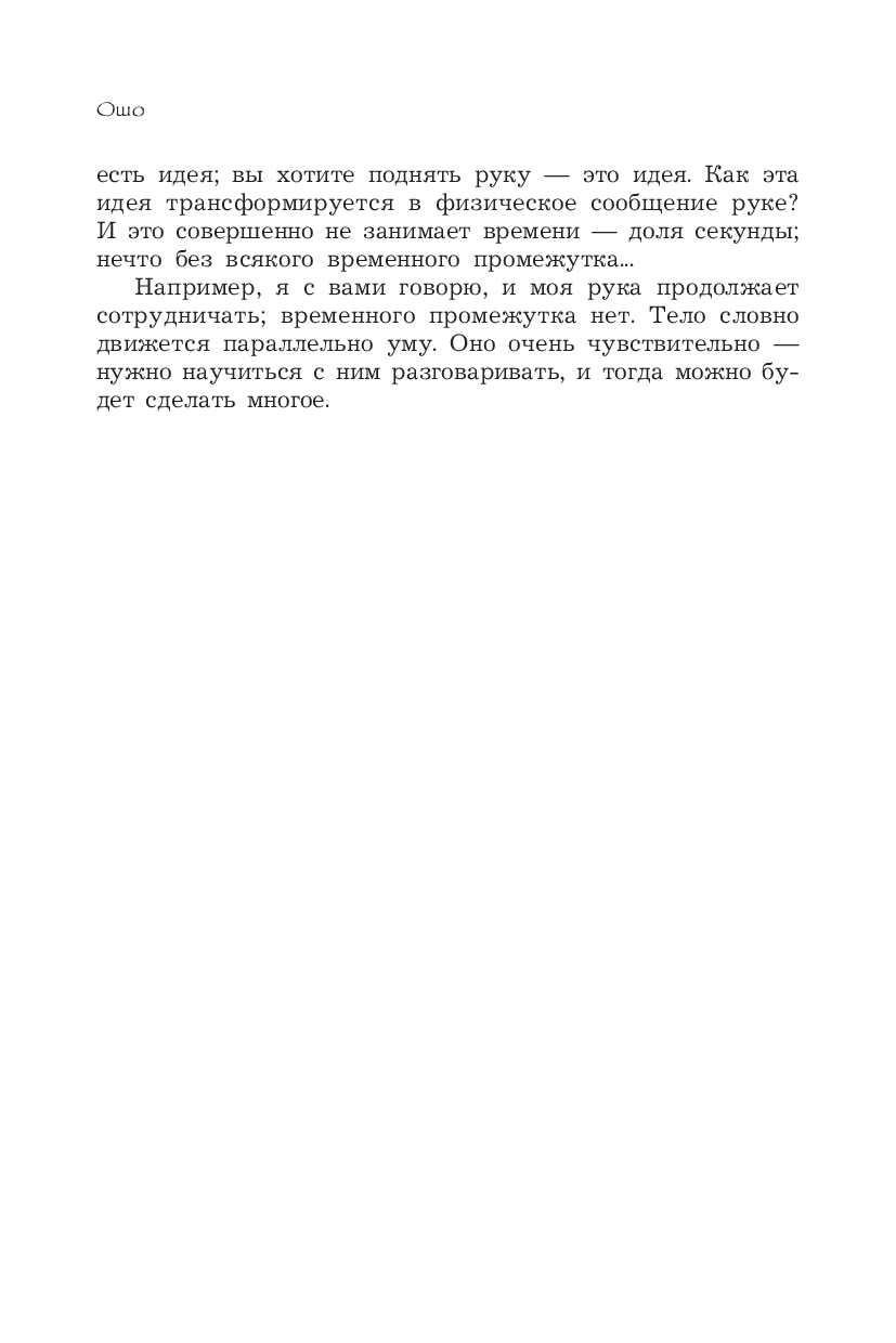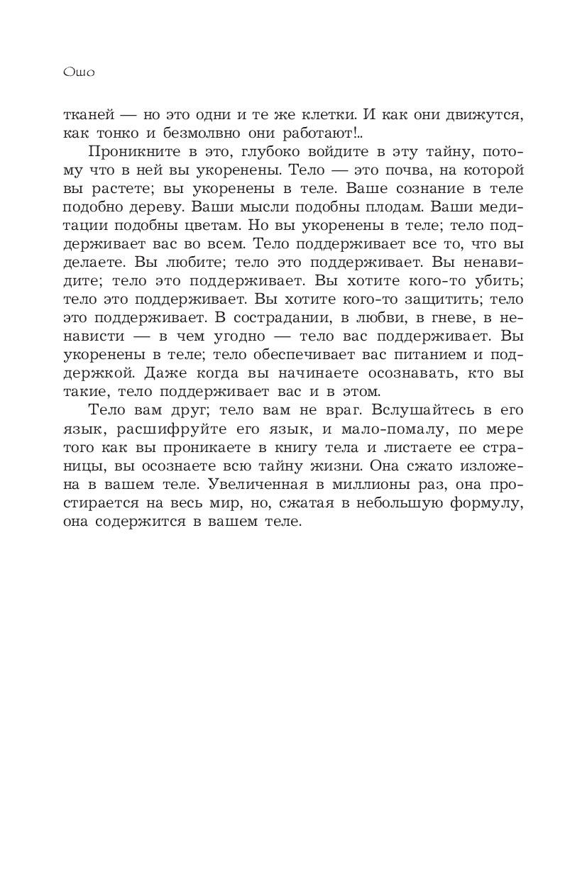 В этой книге, собранной из различных бесед, мы встречаемся с удивительно нежным и благодарным отношением к телу. Ошо передает свое знание с любовью, юмором и глубоким пониманием природы человека. Он подводит нас к мысли о том, что тело знает больше разума.
