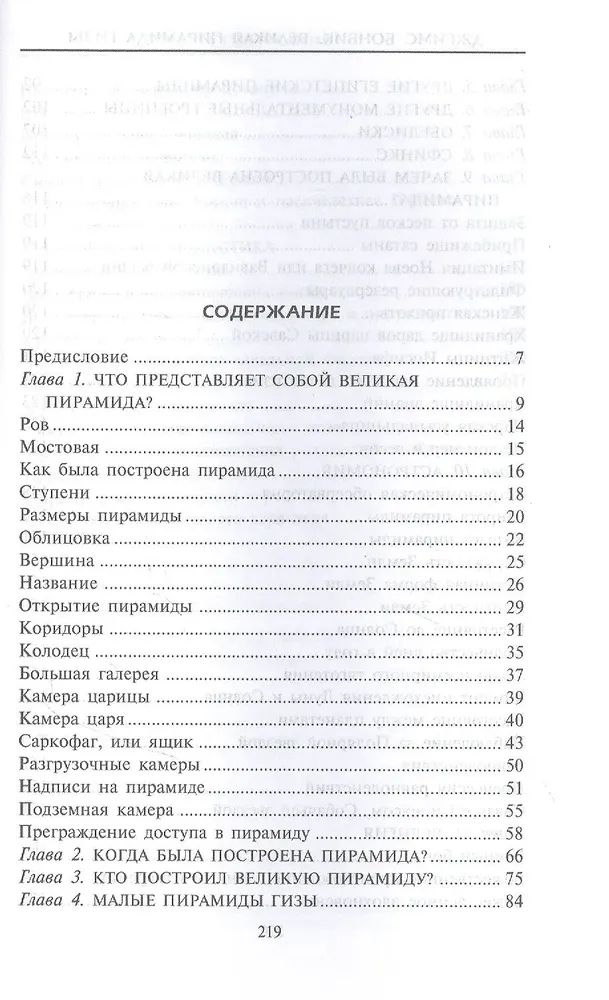 Британский египтолог Джеймс Бонвик одним из первых попытался найти объяснение способу и замыслу постройки Великой пирамиды. В этой книге он предлагает около пятидесяти различных теорий, объясняющих цель этого грандиозного сооружения. Он предпринимает сравнительное исследование, которое охватывает весь комплекс пирамид Гизы, включающий монументальные гробницы, обелиски и Большого Сфинкса. Факты, теории и гипотезы варьируются от самых простых до поистине фантастических.