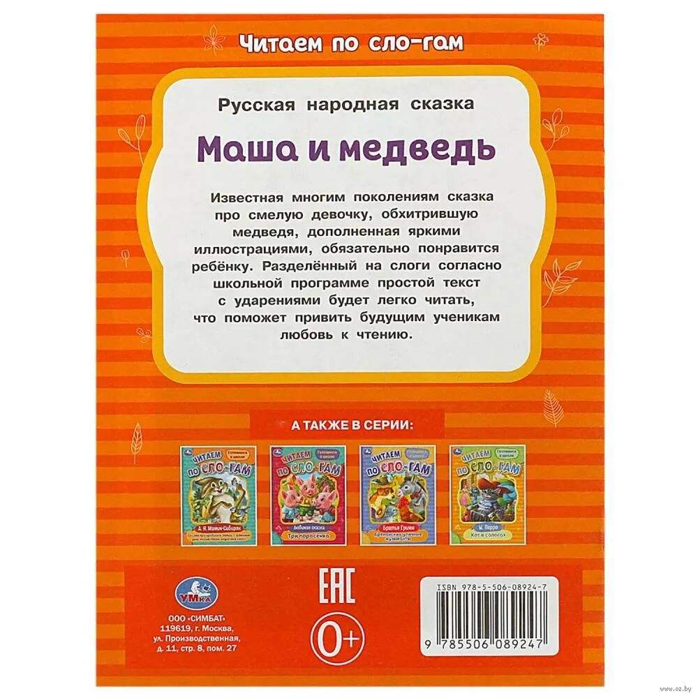 Эта книга-брошюра поможет юному читателю слог за слогом освоить первые шаги в самостоятельном чтении. В ней он найдёт небольшой текст, где в словах проставлены ударения и деления на слоги согласно школьной программе. Интересная история о смелой девочке, перехитрившей медведя, увлечёт ребёнка в волшебную страну книг.