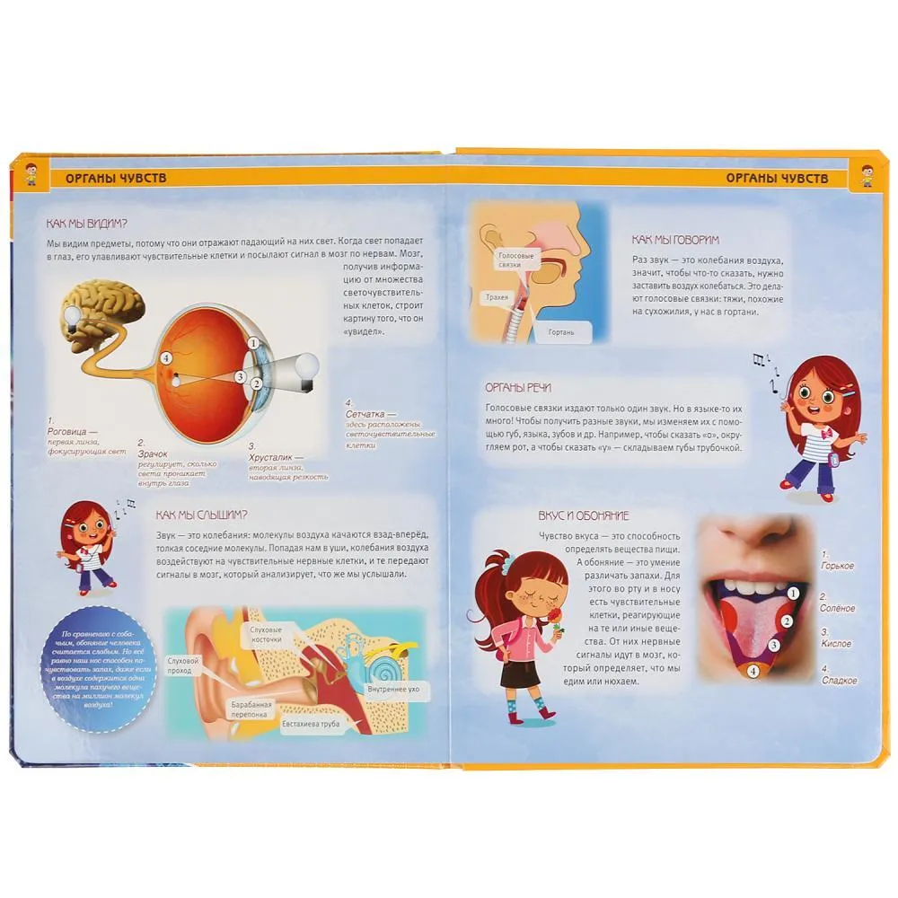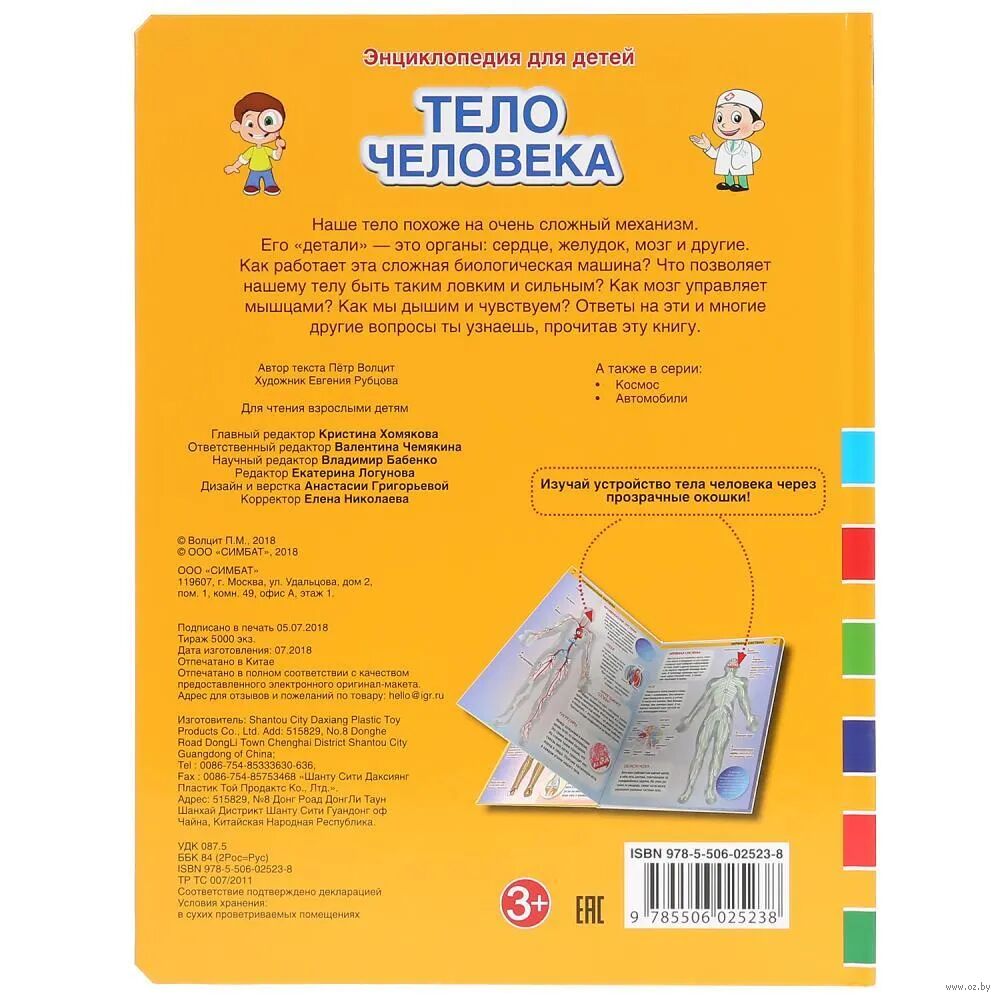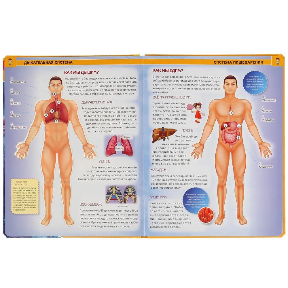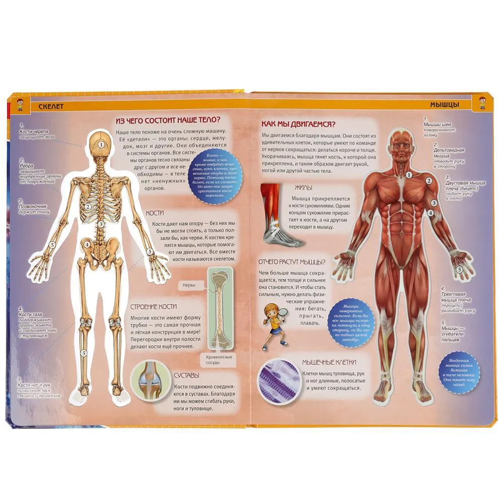 Яркая и красочная энциклопедия познакомит ребёнка с тем, как устроено тело человека. В книге представлены такие темы как: дыхание, мышцы, скелет, пищеварение, кровообращение, нервная система. Можно изучать устройство тела человека через прозрачные окошки. Зрелищные фото и удивительные факты об анатомии человека увлекут ребёнка и помогут ему быстро, эффективно и с удовольствием усвоить новую информацию. Благодаря компактному формату её удобно брать с собой.