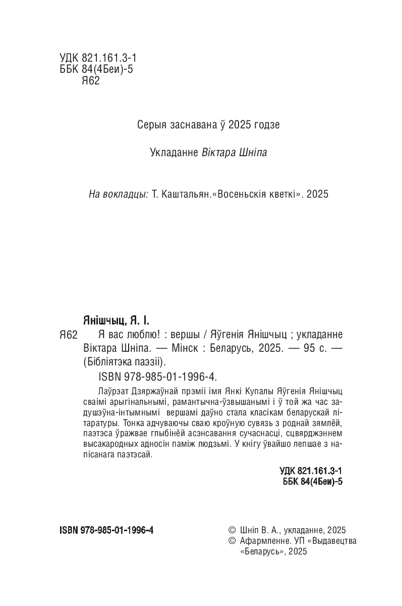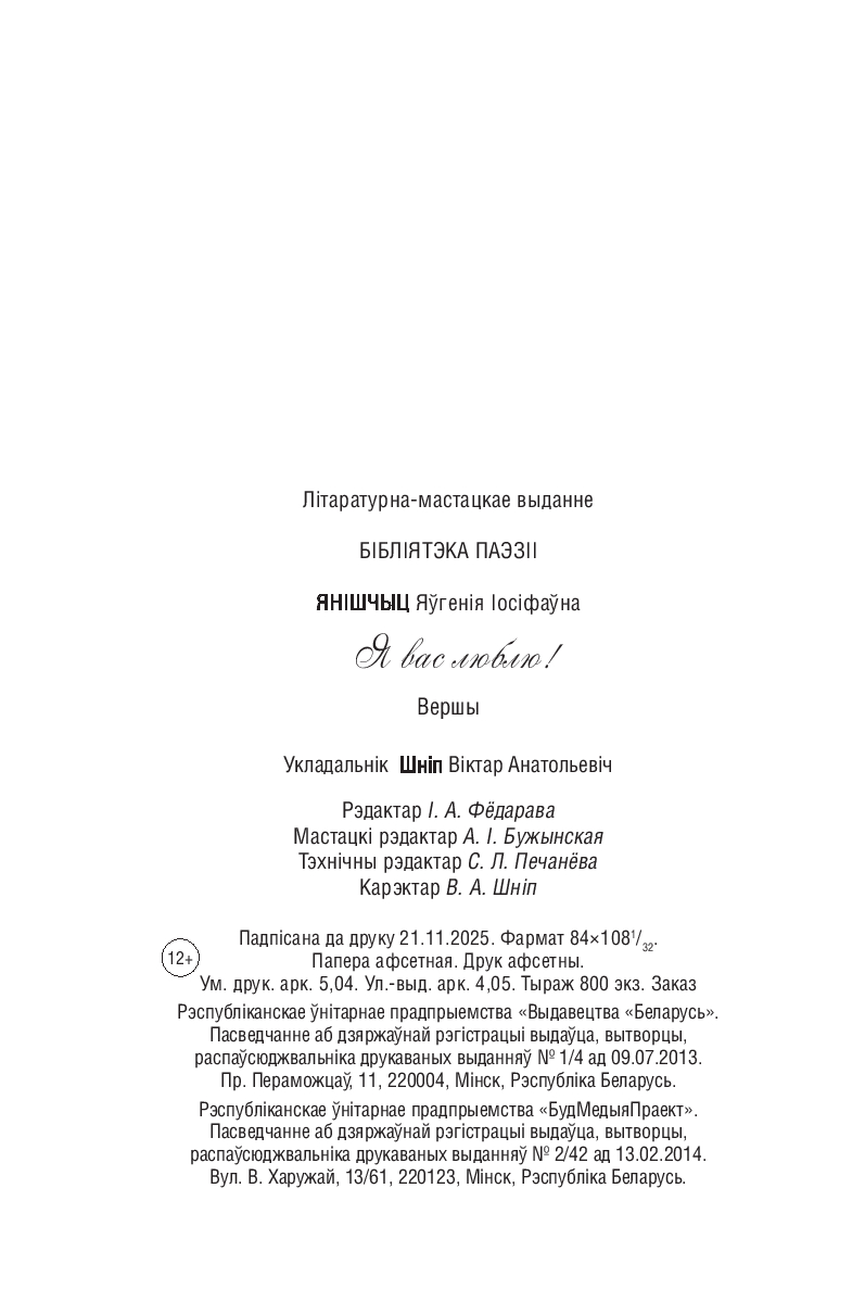 Лаўрэат Дзяржаўнай прэміі імя Янкі Купалы Яўгенія Янішчыц сваімі арыгінальнымі, рамантычна-ўзвышанымі і ў той жа час задушэўна-інтымнымі вершамі даўно стала класікам беларускай літаратуры.
