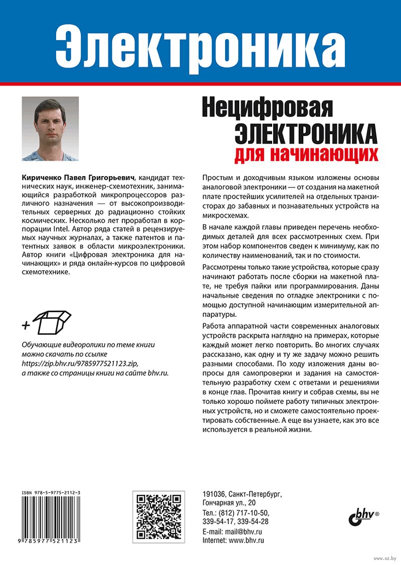Основы аналоговой электроники изложены доступным для начинающих способом – путем создания на макетной плате простых устройств, которые сразу после сборки начинают работать, не требуя пайки и программирования. Набор необходимых деталей сведен к минимуму. Рассмотрены аналоговые сигналы и их свойства, простейшие усилительные схемы на транзисторах, законченные устройства на транзисторах и микросхемах, усилители, генераторы и фильтры.