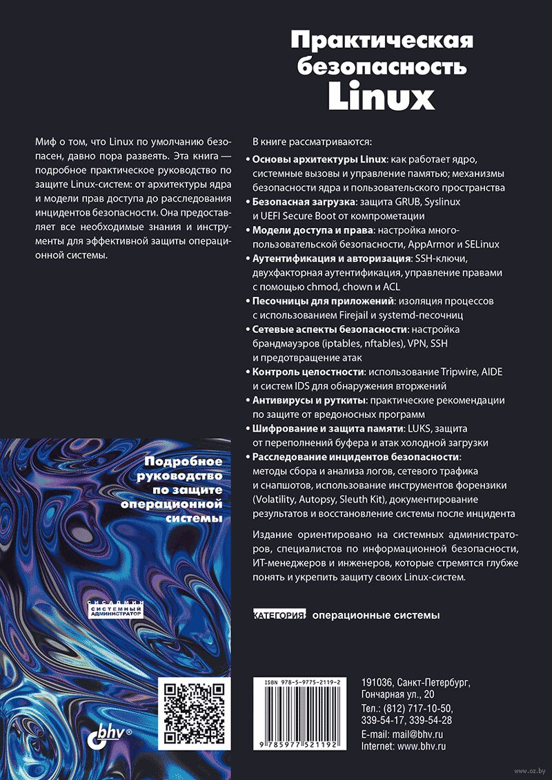 Даны рекомендации по настройке безопасной загрузки, аудиту, журналированию и контролю активности пользователей. Отдельное внимание уделено изоляции приложений, сетевой безопасности, защите данных и памяти, а также противодействию руткитам и вредоносному коду.Рассмотрены методы шифрования, усиления ядра и использования IDS/IPS-систем. Рассказано о защите памяти, настройке компилятора и усилении безопасности ядра.