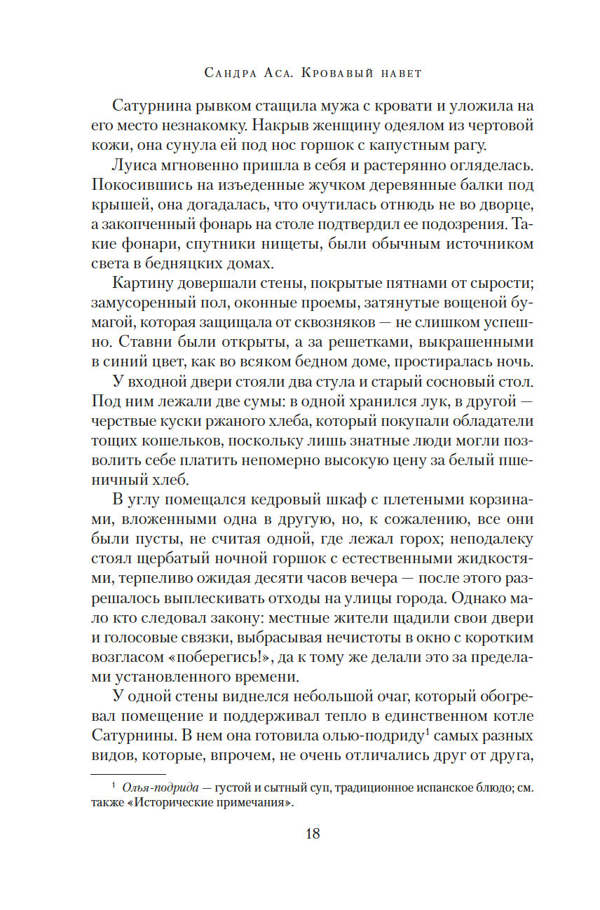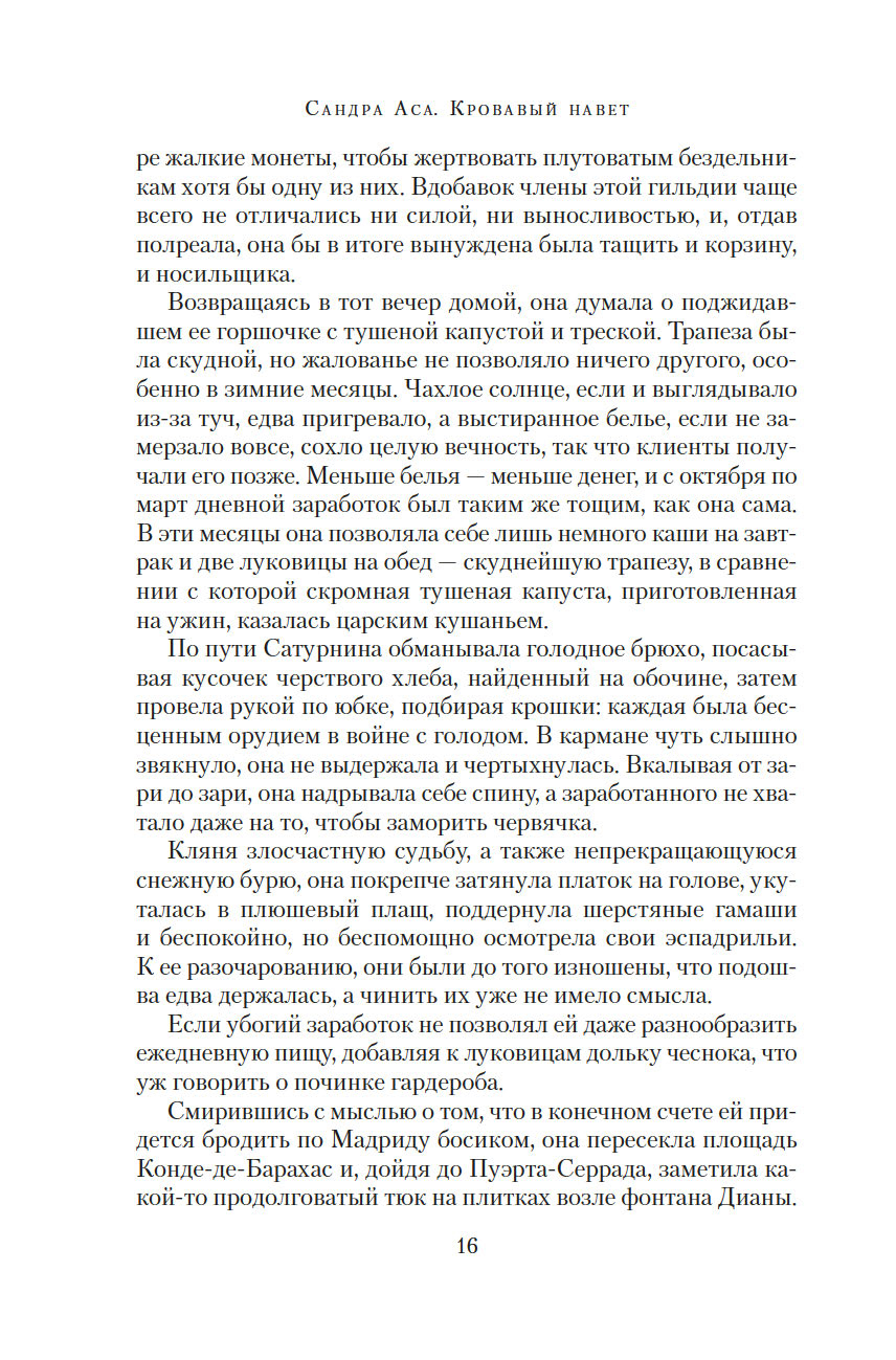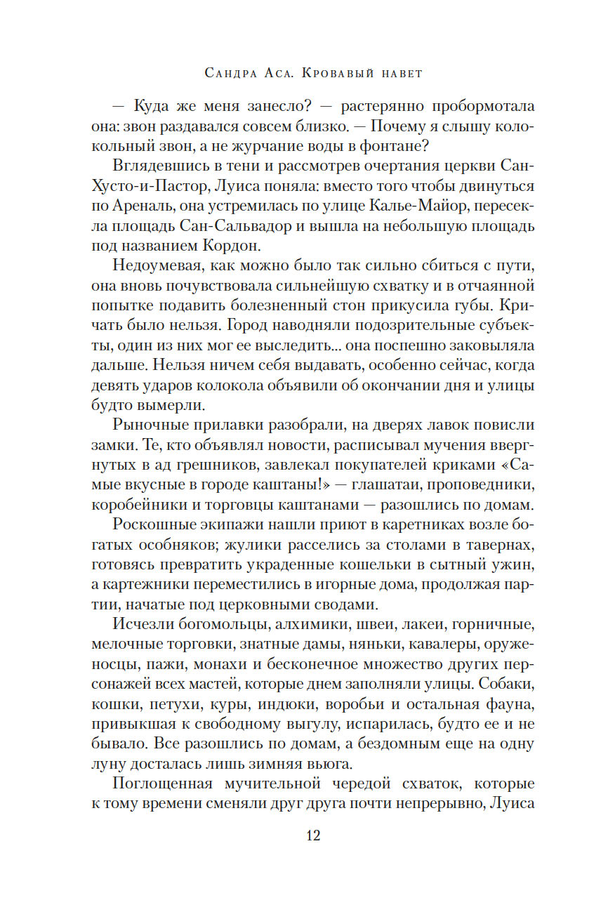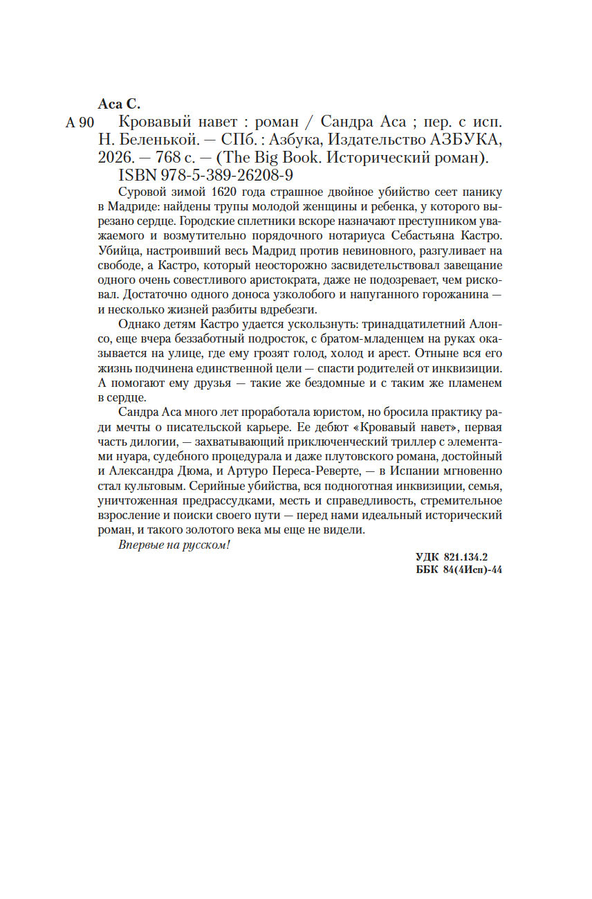 Сандра Аса много лет проработала юристом, но бросила практику ради мечты о писательской карьере. Ее дебют "Кровавый навет", первая часть дилогии, – захватывающий приключенческий триллер с элементами нуара, судебного процедурала и даже плутовского романа, достойный и Александра Дюма, и Артуро Переса-Реверте, – в Испании мгновенно стал культовым. Серийные убийства, вся подноготная инквизиции, семья, уничтоженная предрассудками, месть и справедливость, стремительное взросление и поиски своего пути – перед нами идеальный исторический роман, и такого золотого века мы еще не видели.