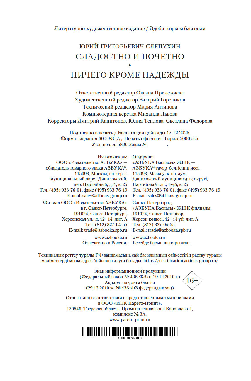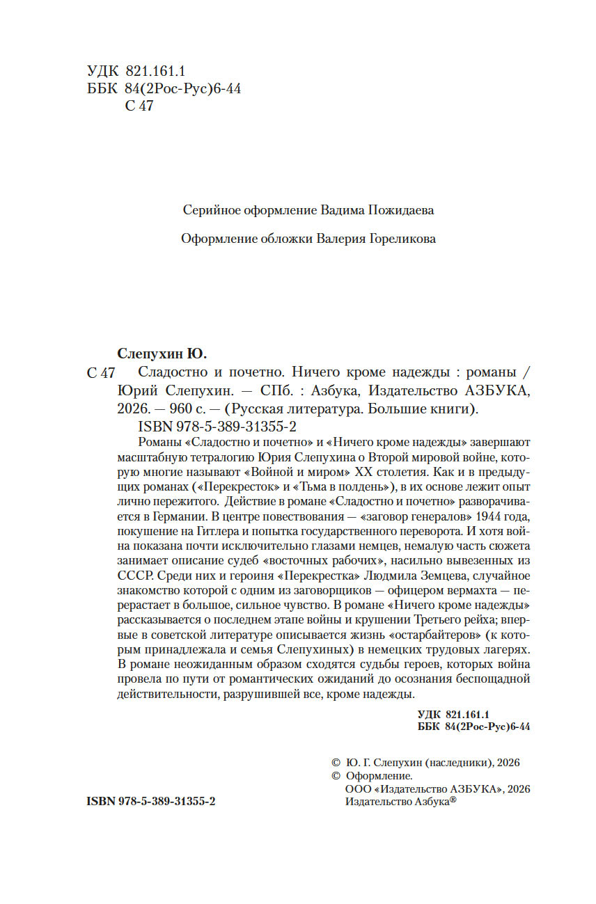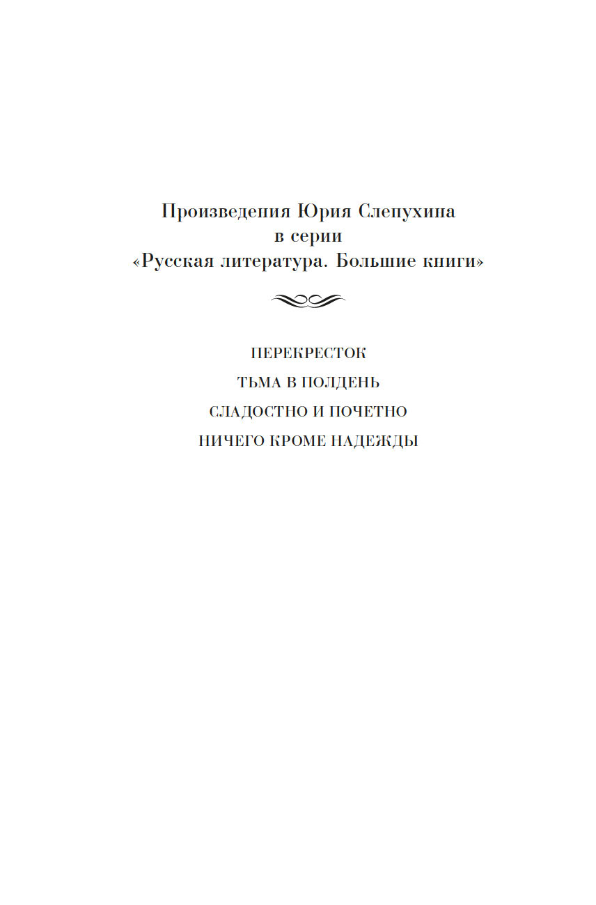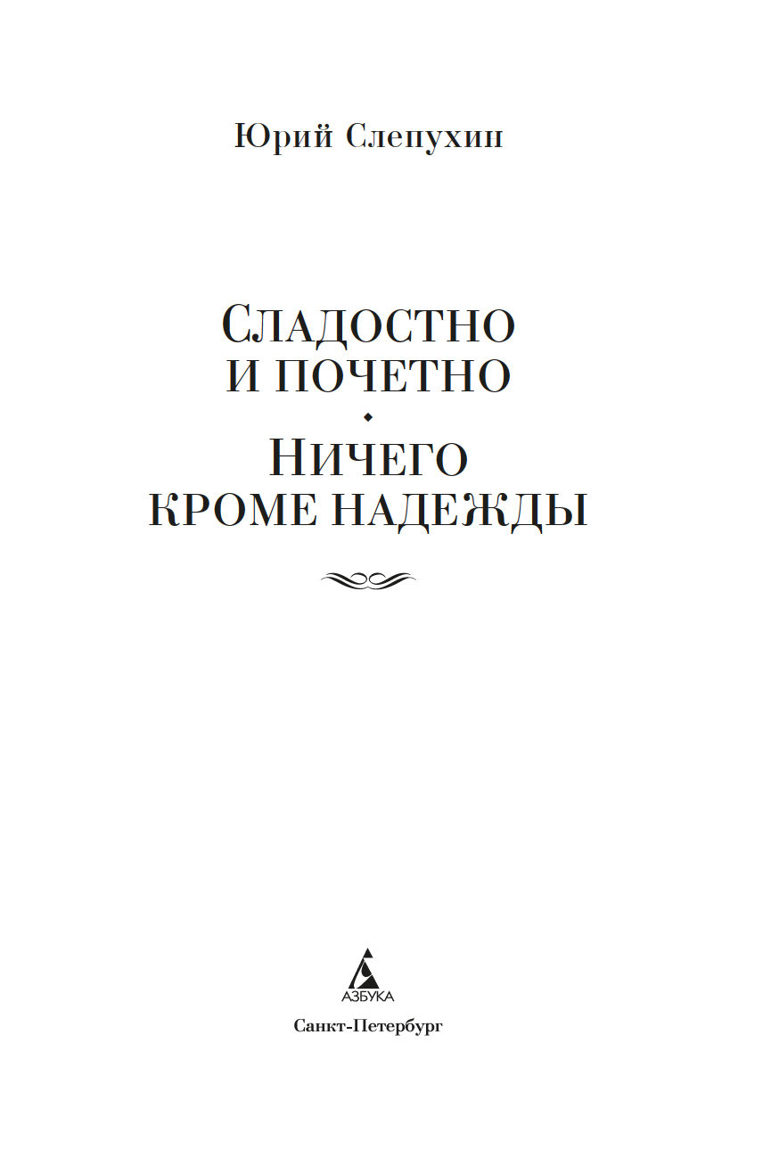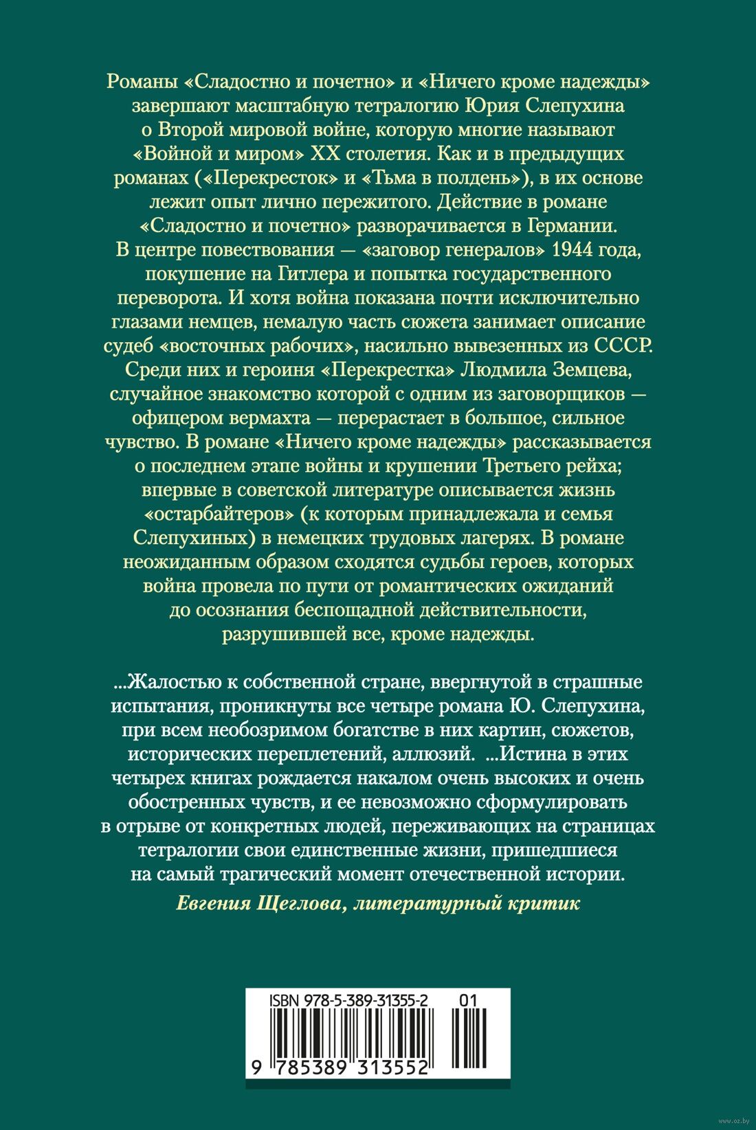Романы "Сладостно и почетно" и "Ничего кроме надежды" завершают масштабную тетралогию Юрия Слепухина о Второй мировой войне, которую многие называют "Войной и миром" XX столетия. Как и в предыдущих романах ("Перекресток" и "Тьма в полдень"), в их основе лежит опыт лично пережитого.