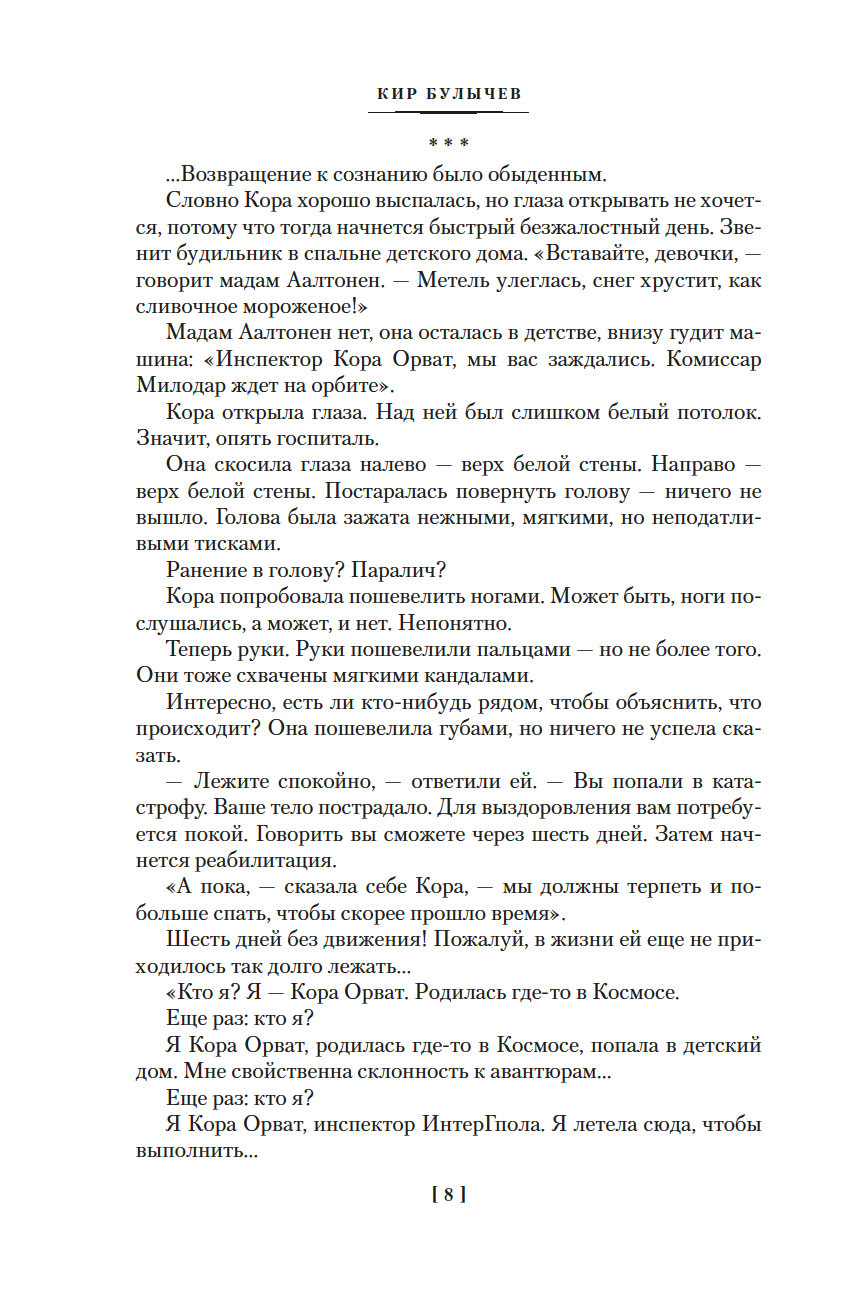 Книга завершает цикл произведений Кира Булычева об агенте ИнтерГалактической полиции Коре Орват, девушке, найденной в младенческом возрасте на одной из отдаленных планет Галактики и воспитывавшейся на Детском острове в сверхсекретном исследовательском интернате-приюте для таких же потерянных сирот, как и она.