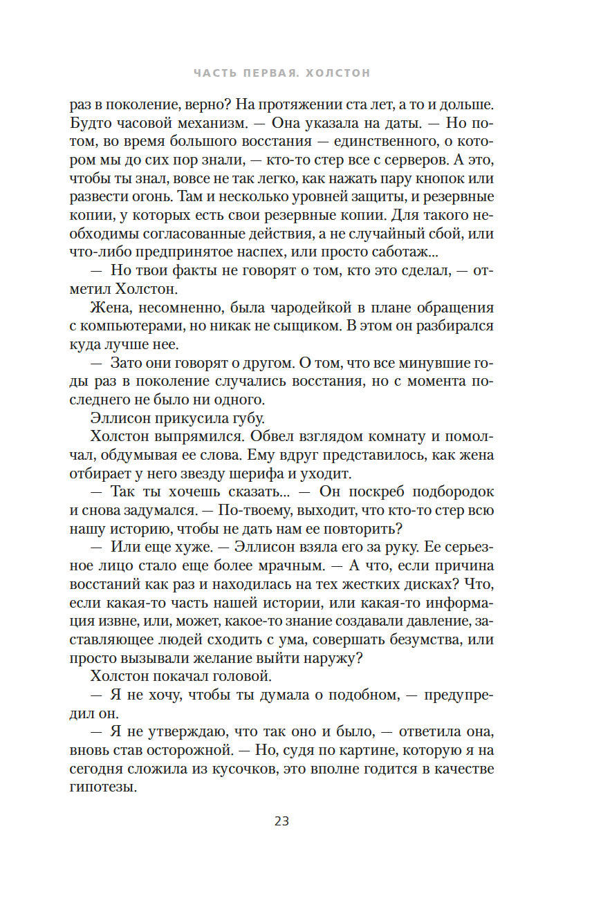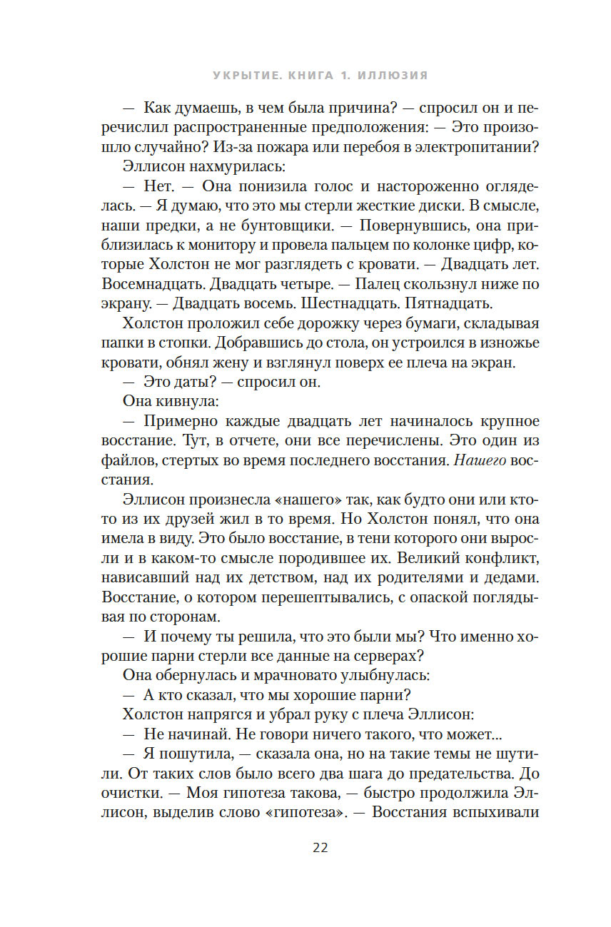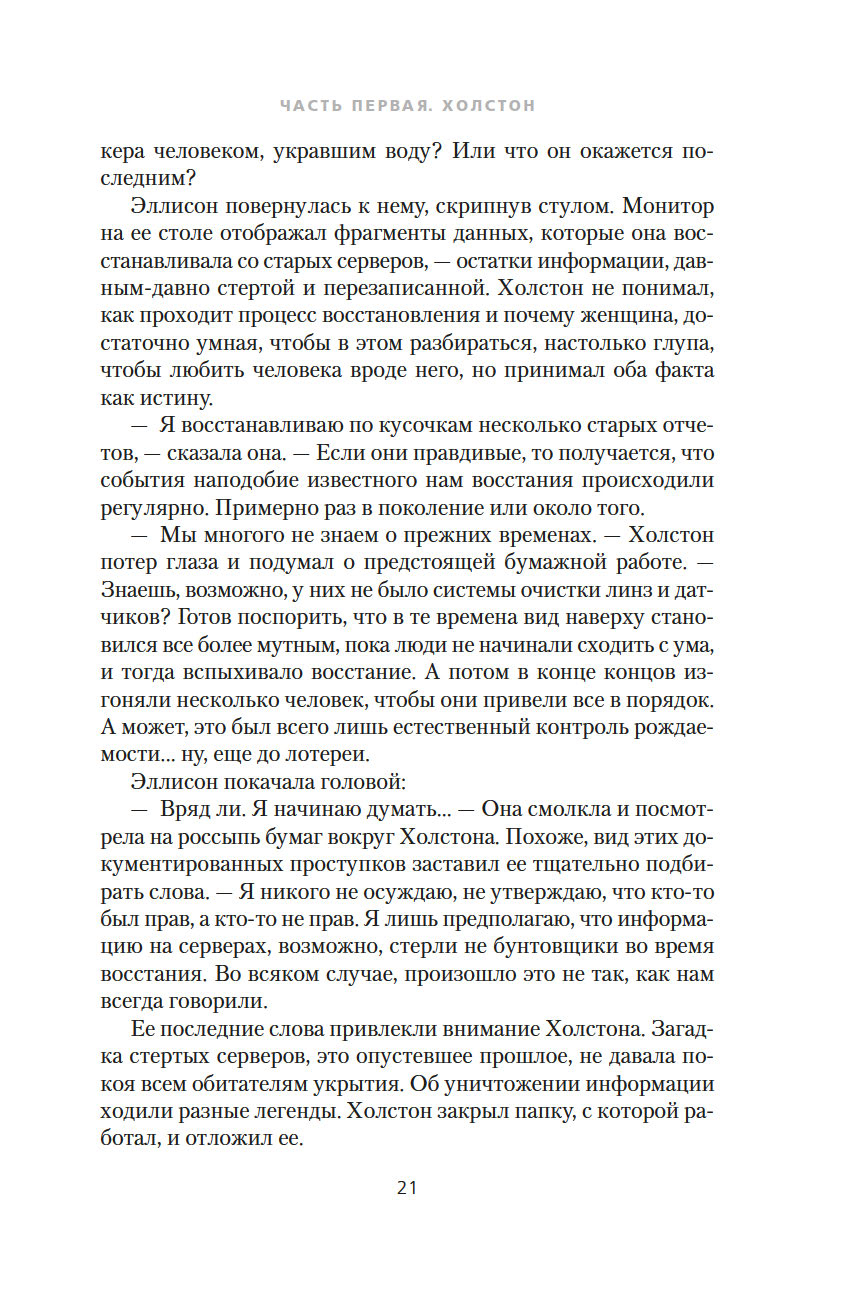Жизнь в укрытии строго регламентирована. Кастовая система. Если ты носильщик, то никто другой не имеет права переносить грузы с уровня на уровень. Если ты работаешь на генераторе, поставляющем энергию на все уровни, то не можешь заниматься ничем иным. А уж тем более сектор АйТи, святая святых системы, главный поставщик информации об окружающем мире. Правда, никто не знает, так ли уж правдива поставляемая сектором информация, а персонал АйТи не допускает посторонних в свои владения...
