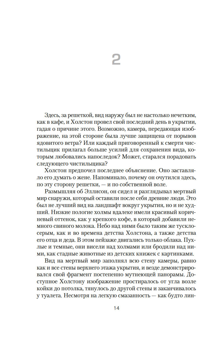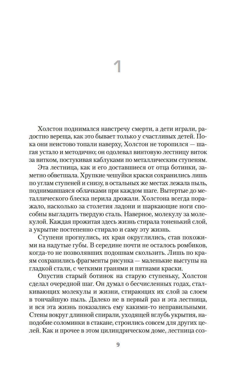 Постапокалиптический мир. Люди живут в огромнейшем искусственном бункере-укрытии. Из поколения в поколение. Выход наверх, наружу смертельно опасен. "Добровольцы", которые отправляются время от времени на очистку, то есть протирать линзы камер наружного наблюдения, через короткое время умирают.