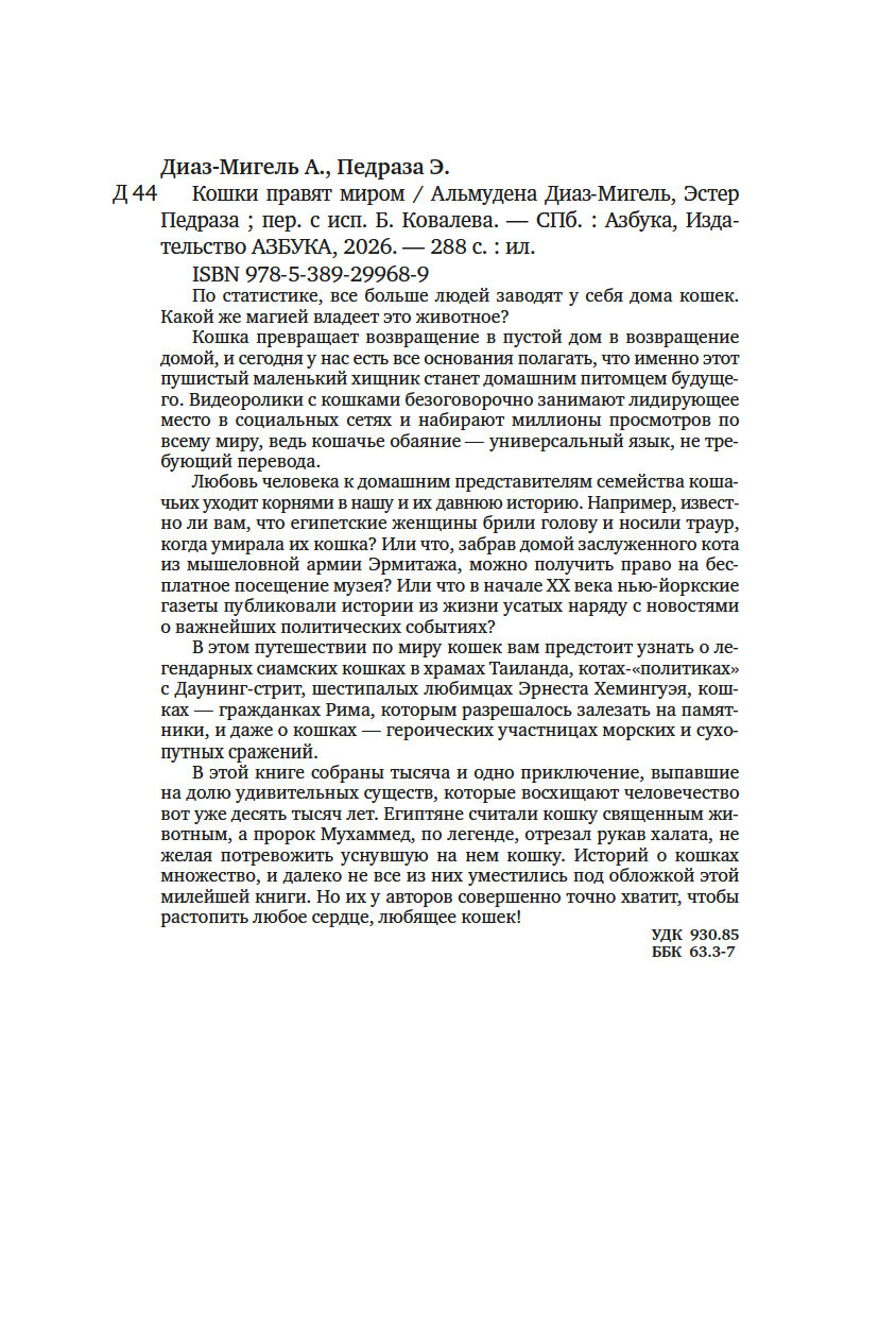В этом путешествии по миру кошек вам предстоит узнать о легендарных сиамских кошках в храмах Таиланда, котах-"политиках" с Даунинг-стрит, шестипалых любимцах Эрнеста Хемингуэя, кошках – гражданках Рима, которым разрешалось залезать на памятники, и даже о кошках – героических участницах морских и сухопутных сражений.