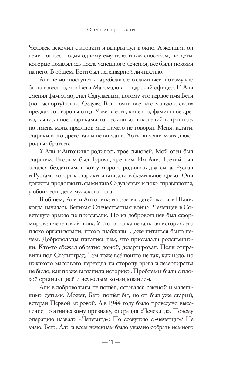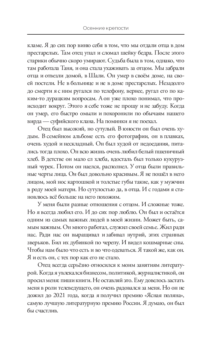 В серии "Почти Собрание Сочинений" – новая книга прозаика и поэта Германа Садулаева. Называется она "Осенние крепости". И под словом "крепости" стоит понимать как твердыни и кремлёвские сооружения, защищающие от внешнего воздействия, так и дух самой высшей пробы, помогающий держаться при обороне и сражаться до конца, а помимо того – и запредельный градус осмысления бытия. "Осенние" же они потому, что осенены Словом. Перед вами первая подробнейшая автобиография писателя, ранее не публиковавшиеся стихотворения, а также избранная проза – всё, что позволяет называть Германа Садулаева живым классиком.