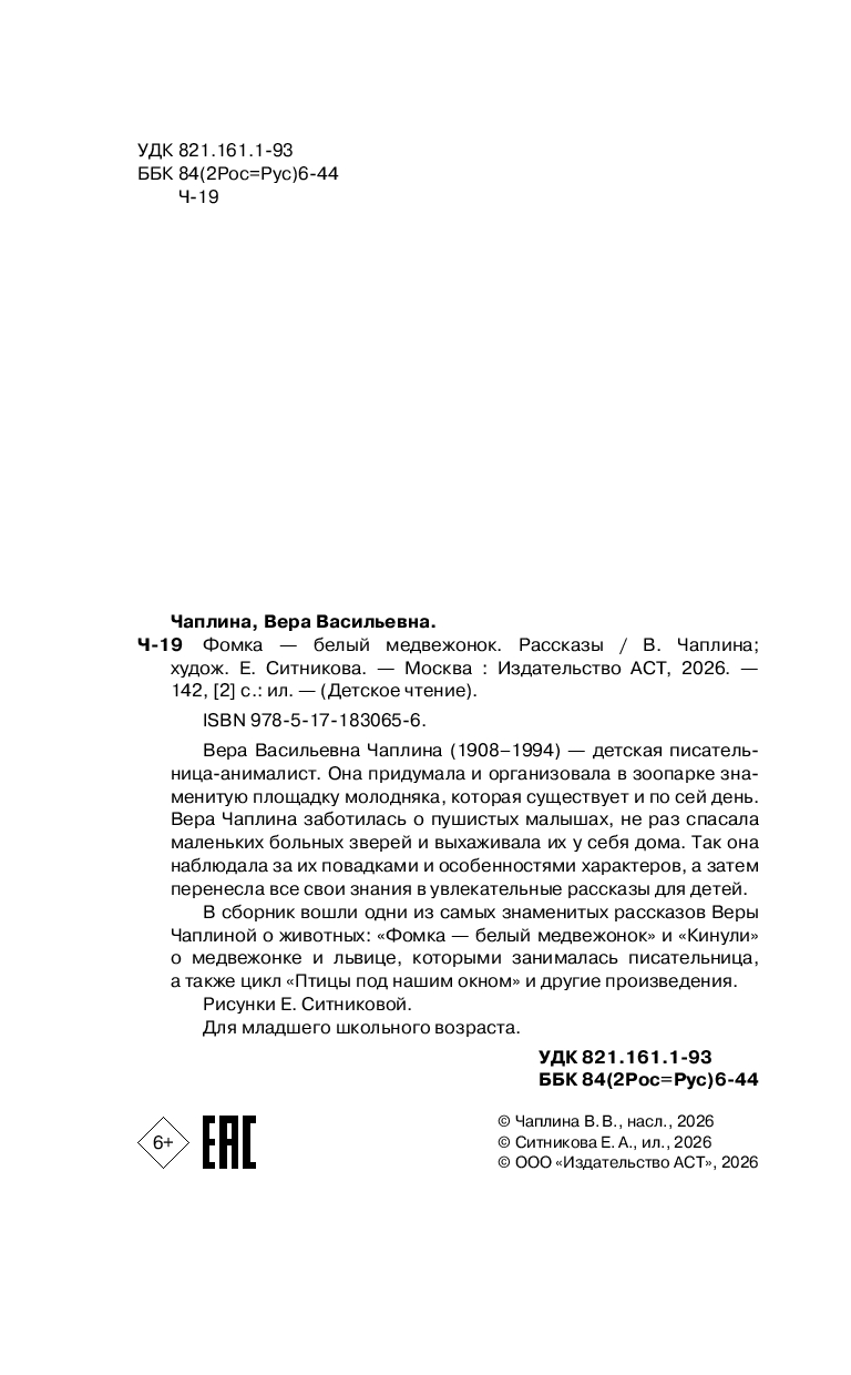 В сборник вошли одни из самых знаменитых рассказов Веры Чаплиной о животных: "Фомка – белый медвежонок" и "Кинули" о медвежонке и львице, которыми занималась писательница, а также цикл "Птицы под нашим окном" и другие произведения.