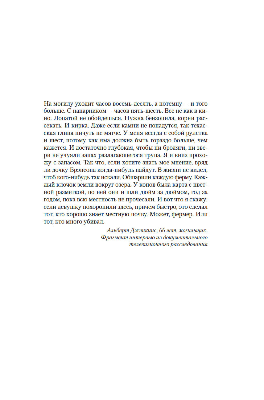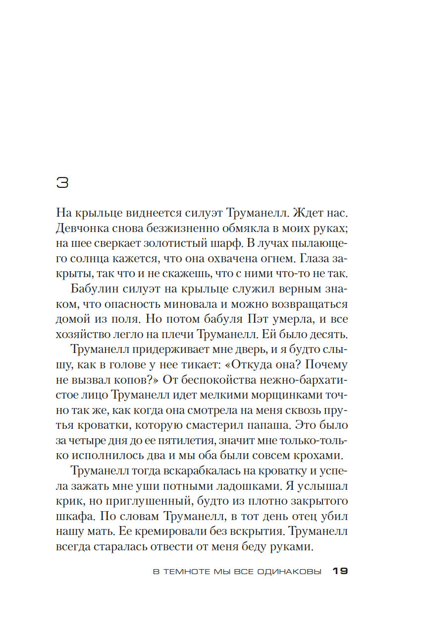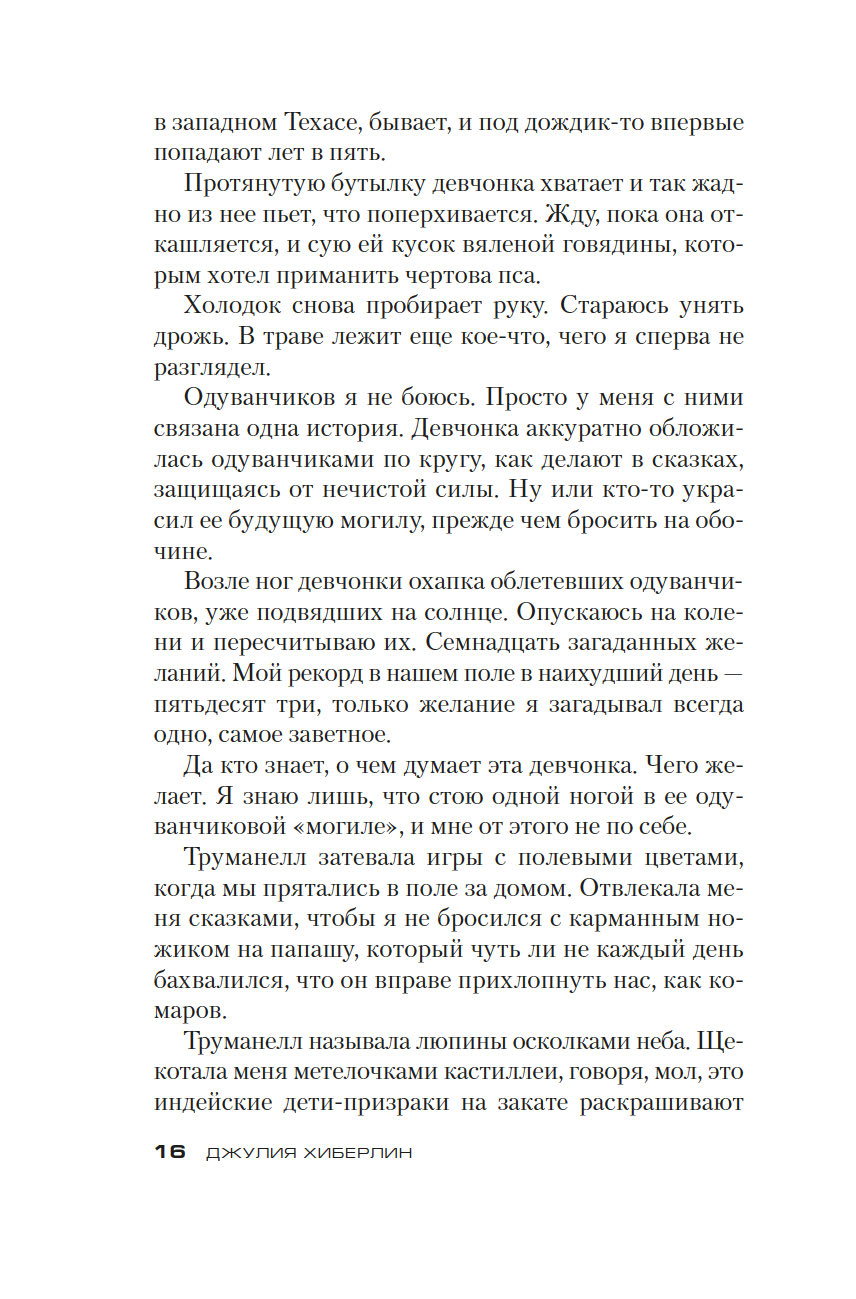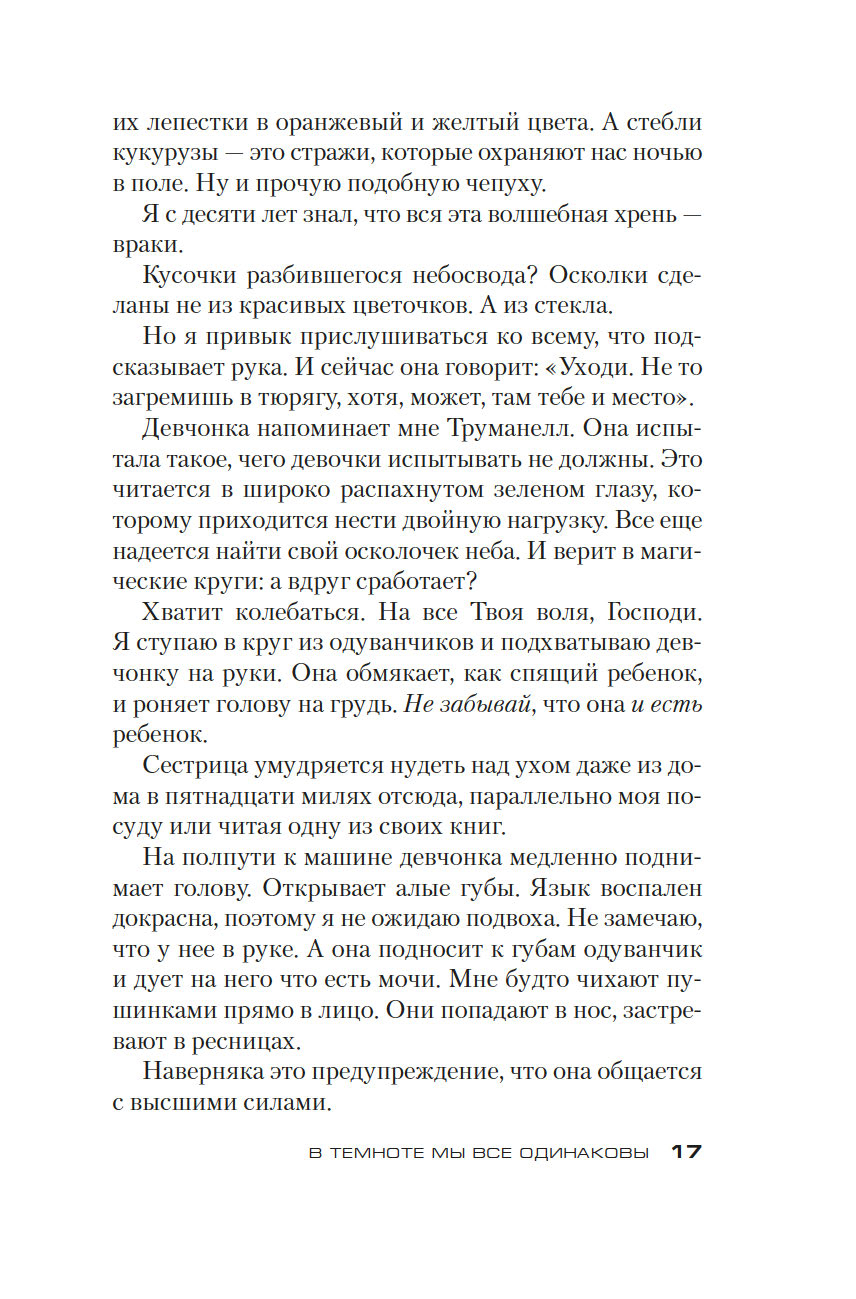 Десять лет назад Труманелл Брэнсон бесследно исчезла, оставив после себя лишь кровавый отпечаток ладони на дверном косяке. Все в городке убеждены, что виноват ее старший брат Уайатт, хотя подозрения полиции на его счет не подтвердились. Однажды на обочине дороги, у поля, он находит девочку-подростка: немая, с розовым в блестках шарфиком, прикрывающим пустую глазницу, та "аккуратно обложилась одуванчиками по кругу, как делают в сказках, защищаясь от нечистой силы", и кого-то очень боится.