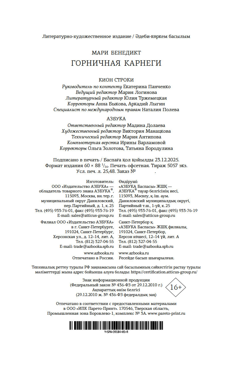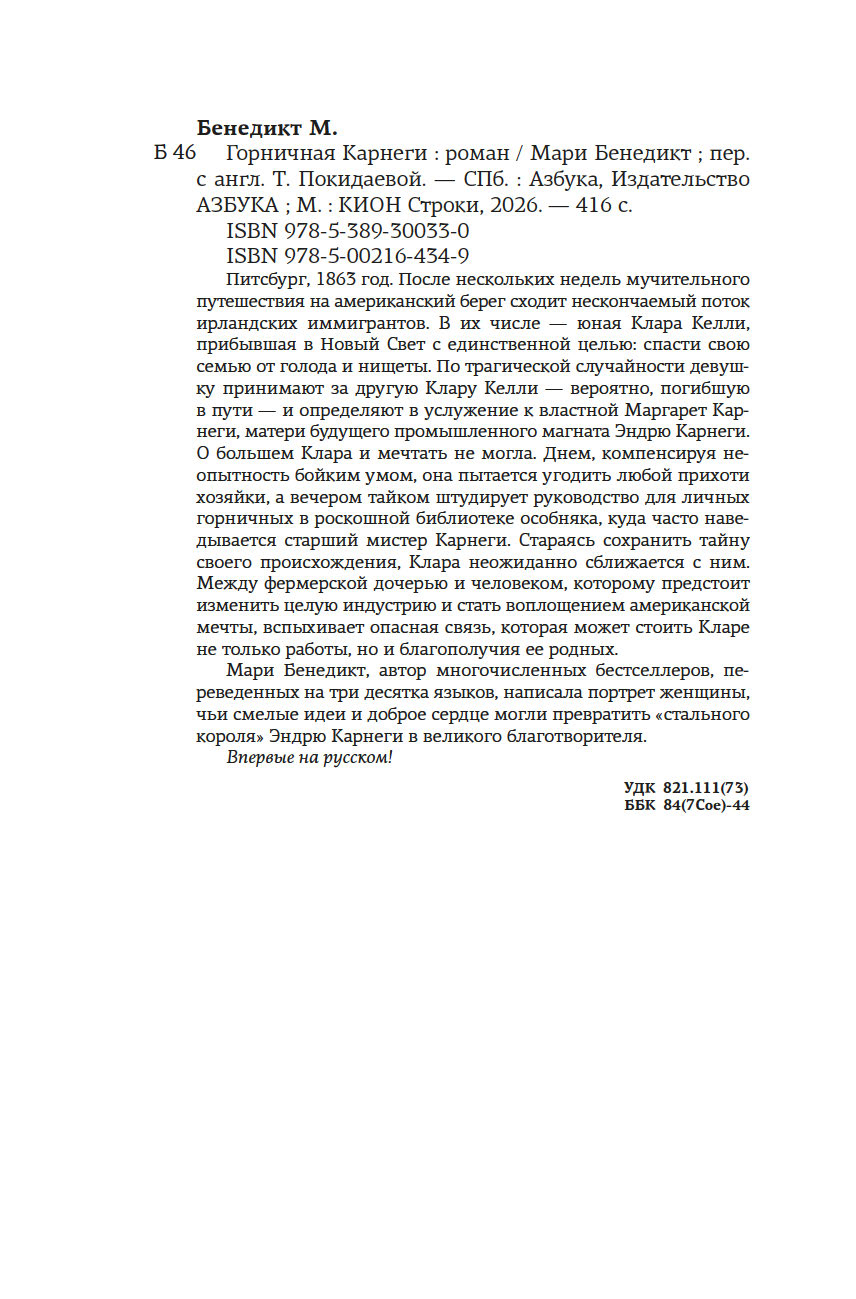 Мари Бенедикт, автор многочисленных бестселлеров, переведенных на три десятка языков, написала портрет женщины, чьи смелые идеи и доброе сердце могли превратить "стального короля" Эндрю Карнеги в великого благотворителя.