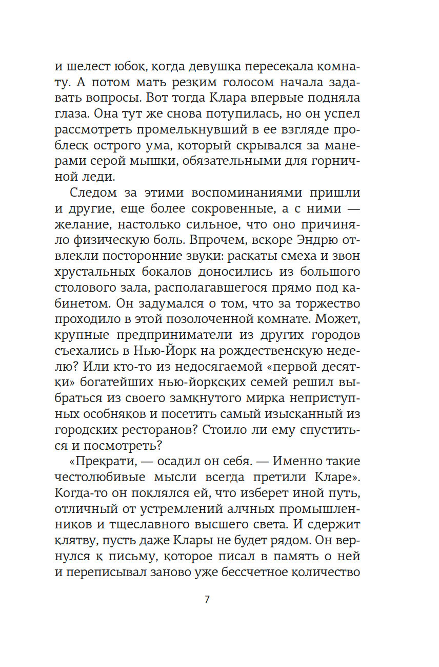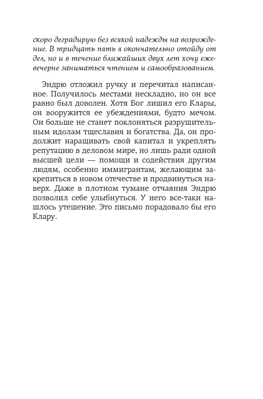 Питсбург, 1863 год. После нескольких недель мучительного путешествия на американский берег сходит нескончаемый поток ирландских иммигрантов. В их числе – юная Клара Келли, прибывшая в Новый Свет с единственной целью: спасти свою семью от голода и нищеты. По трагической случайности девушку принимают за другую Клару Келли – вероятно, погибшую в пути – и определяют в услужение к властной Маргарет Карнеги, матери будущего промышленного магната Эндрю Карнеги. О большем Клара и мечтать не могла. Днем, компенсируя неопытность бойким умом, она пытается угодить любой прихоти хозяйки, а вечером тайком штудирует руководство для личных горничных в роскошной библиотеке особняка, куда часто наведывается старший мистер Карнеги. Стараясь сохранить тайну своего происхождения, Клара неожиданно сближается с ним. Между фермерской дочерью и человеком, которому предстоит изменить целую индустрию и стать воплощением американской мечты, вспыхивает опасная связь, которая может стоить Кларе не только работы, но и благополучия ее родных.