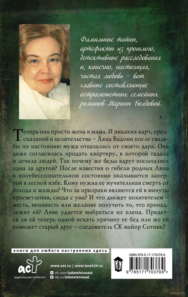 Теперь она просто жена и мама. И никаких карт, предсказаний и целительства – Ляна Бадони после свадьбы по настоянию мужа отказалась от своего дара. Она даже согласилась продать квартиру, в которой гадала и лечила людей. Так почему же беды вдруг посыпались одна за другой? После известия о гибели родных Ляна в полубессознательном состоянии оказывается запертой в лесной избе. Кому нужна ее мучительная смерть от голода и жажды? Что за призраки являются ей в минуты просветления, сводя с ума? И что движет похитителем – месть, ненависть или желание получить то, что принадлежит ей? Ляне удается выбраться из плена. Придется ли ей теперь одной искать причину ее бед или же ей поможет старый друг – следователь СК майор Сотник?