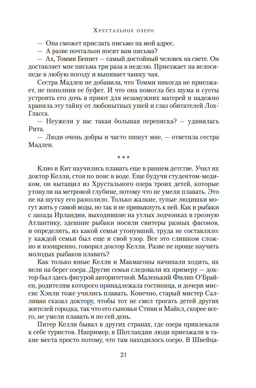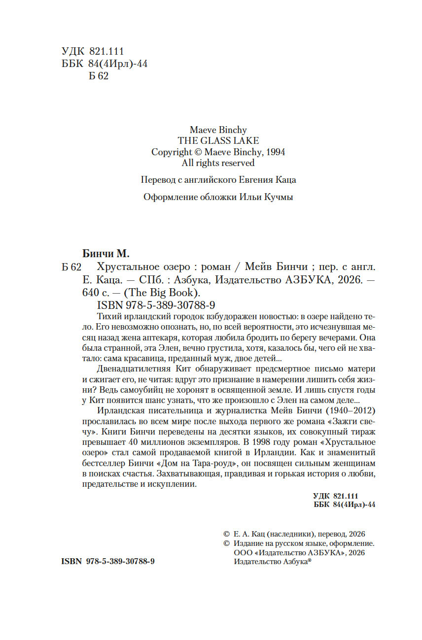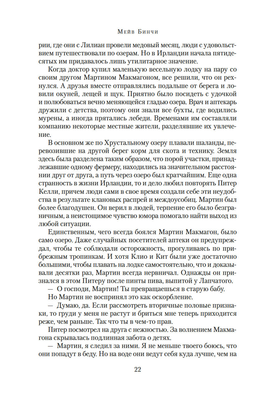 Ирландская писательница и журналистка Мейв Бинчи (1940-2012) прославилась во всем мире после выхода первого же романа "Зажги свечу". Книги Бинчи переведены на десятки языков, их совокупный тираж превышает 40 миллионов экземпляров. В 1998 году роман "Хрустальное озеро" стал самой продаваемой книгой в Ирландии. Как и знаменитый бестселлер Бинчи "Дом на Тара-роуд", он посвящен сильным женщинам в поисках счастья. Захватывающая, правдивая и горькая история о любви, предательстве и искуплении.