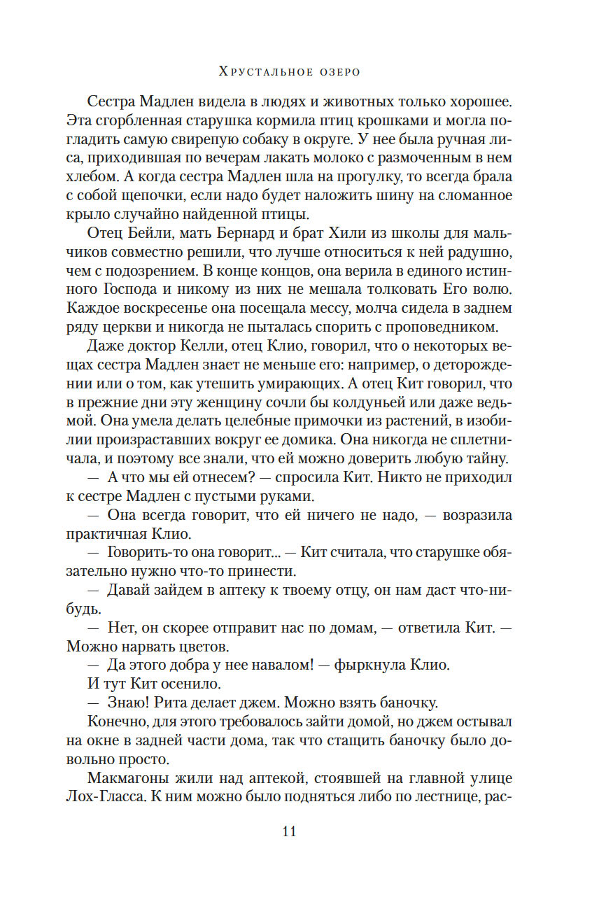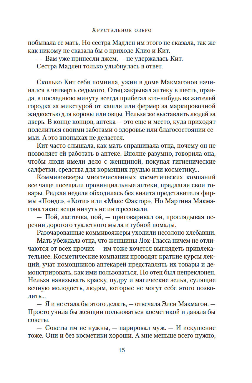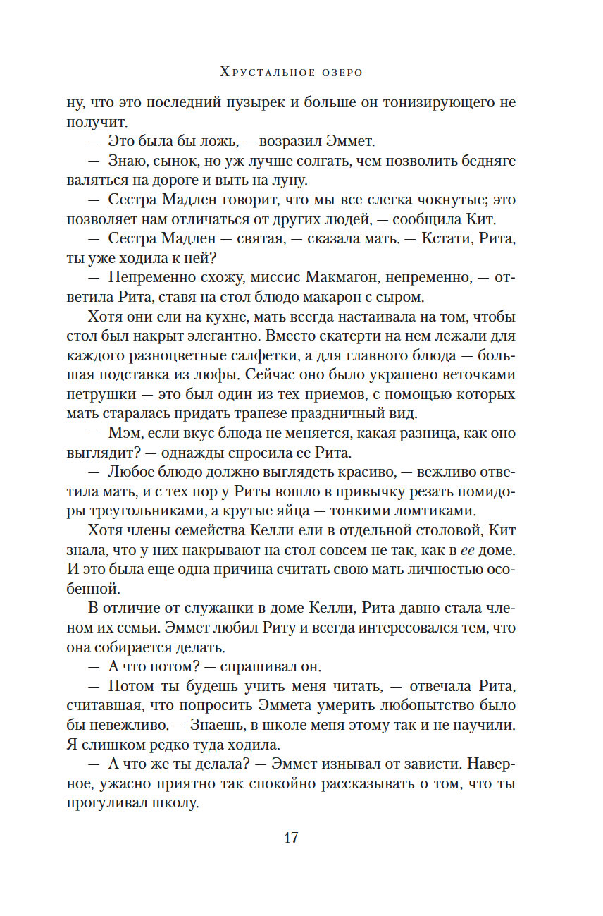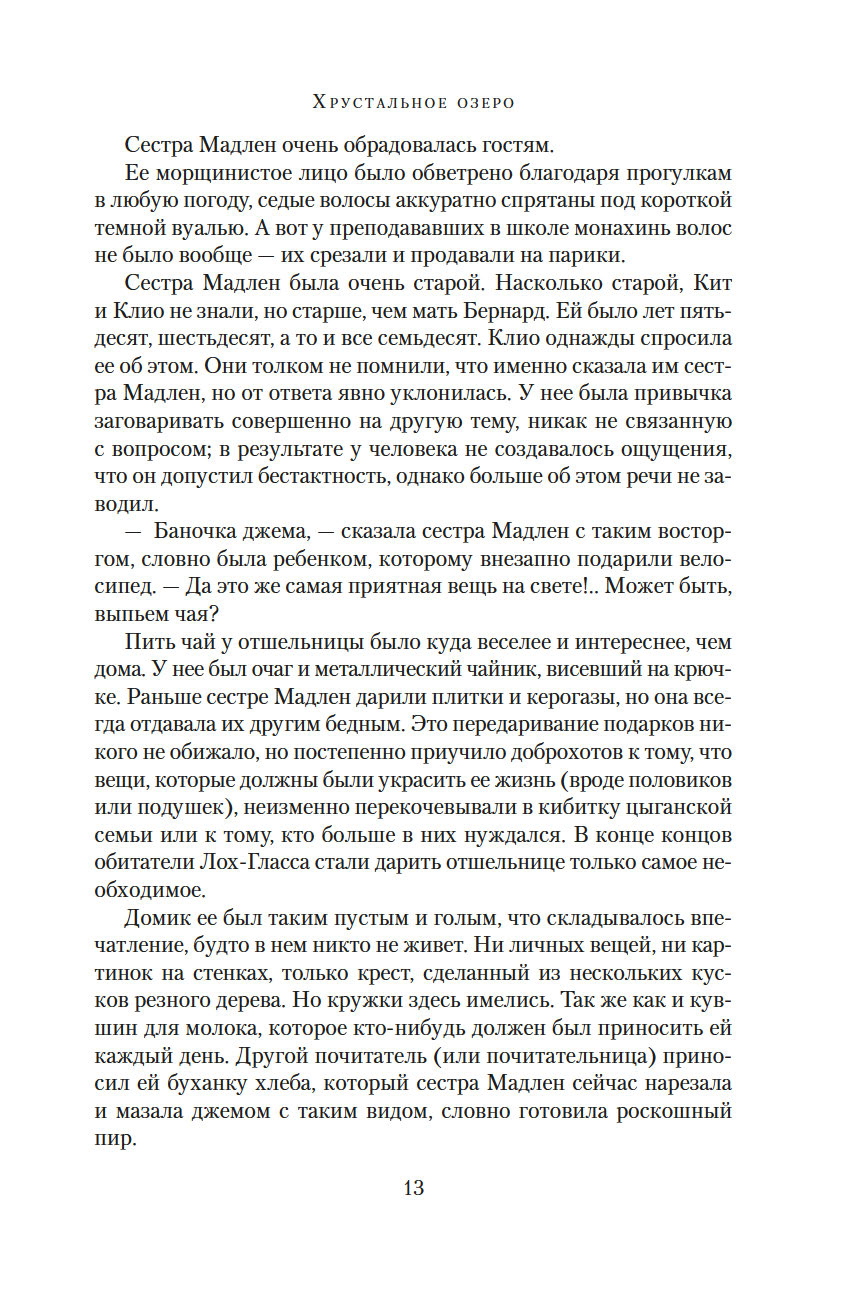 Ирландская писательница и журналистка Мейв Бинчи (1940-2012) прославилась во всем мире после выхода первого же романа "Зажги свечу". Книги Бинчи переведены на десятки языков, их совокупный тираж превышает 40 миллионов экземпляров. В 1998 году роман "Хрустальное озеро" стал самой продаваемой книгой в Ирландии. Как и знаменитый бестселлер Бинчи "Дом на Тара-роуд", он посвящен сильным женщинам в поисках счастья. Захватывающая, правдивая и горькая история о любви, предательстве и искуплении.