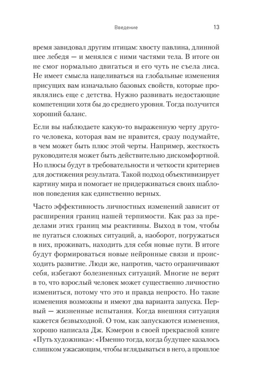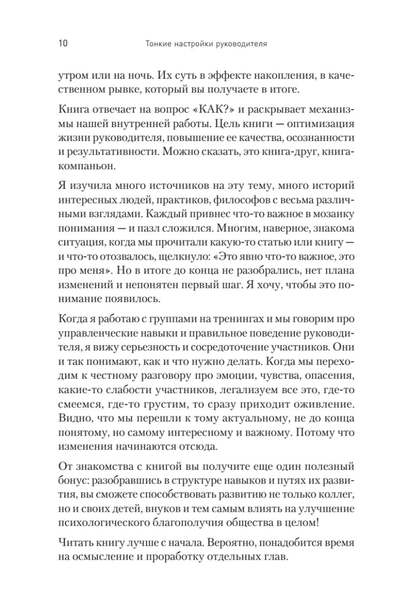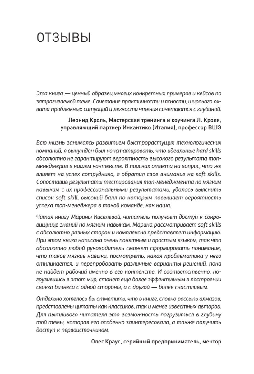 Эта книга о личной эффективности, способах ее развития, внутренних ресурсах, которые есть у каждого. В ее основе истории многих руководителей, участников тренингов, опыт успешных проектов по формированию компетенций руководителей. Речь пойдет о так называемых softskills – мягких надпрофессиональных навыках, которые отвечают за успешное участие в рабочем процессе, высокую производительность и являются сквозными, то есть, не связаны с конкретной предметной областью. Эффект от применения мягких навыков замечен в самых разных сферах. А также известно, что эти навыки можно развивать в любом возрасте.