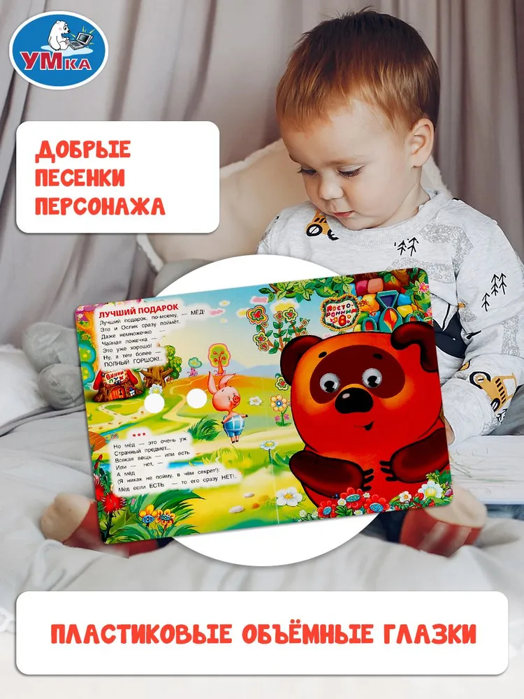 В комплекте вы найдете 3 книжки: Песенки Винни-Пуха. Б. Заходер, Паровозик из Ромашково. Г. Цыферов и Котёнок и щенок. Каждая из них заполнена яркими, красочными иллюстрациями, которые захватят воображение ребенка. Пластиковые объёмные глазки добавляют особое очарование, привлекая взгляд маленьких читателей.