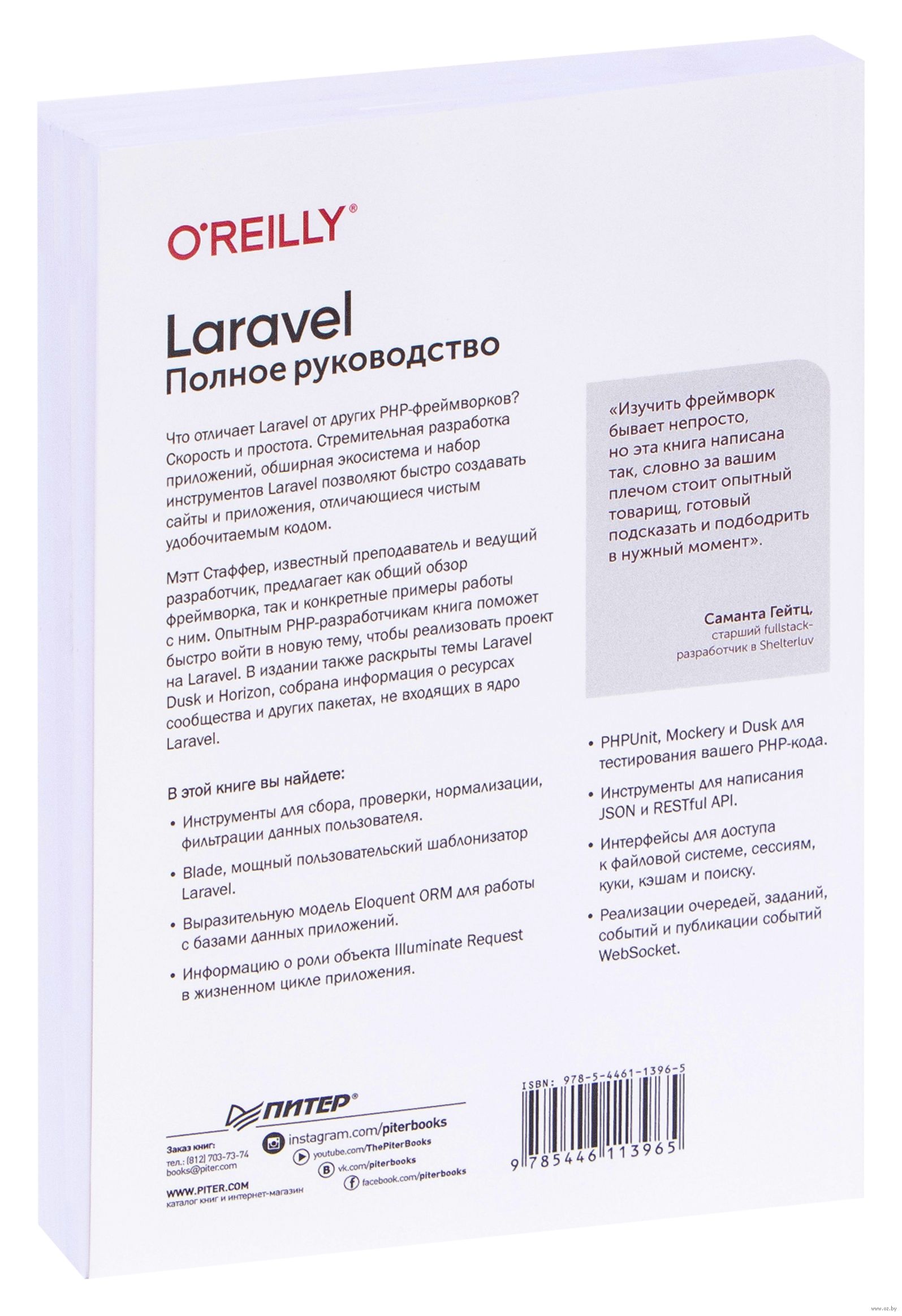 Мэтт Стаффер, известный преподаватель и ведущий разработчик, предлагает как общий обзор фреймворка, так и конкретные примеры работы с ним. Опытным PHP-разработчикам книга поможет быстро войти в новую тему, чтобы реализовать проект на Laravel. В издании также раскрыты темы Laravel Dusk и Horizon, собрана информация о ресурсах сообщества и других пакетах, не входящих в ядро Laravel.