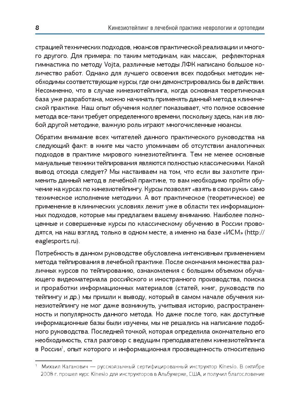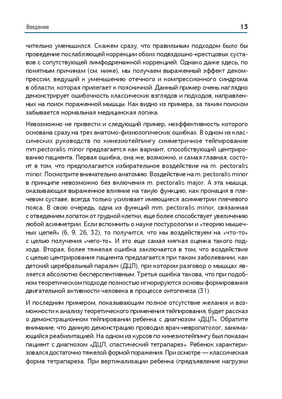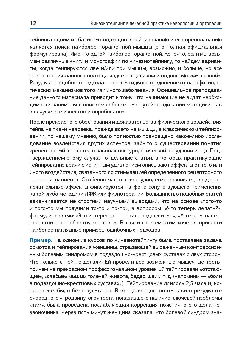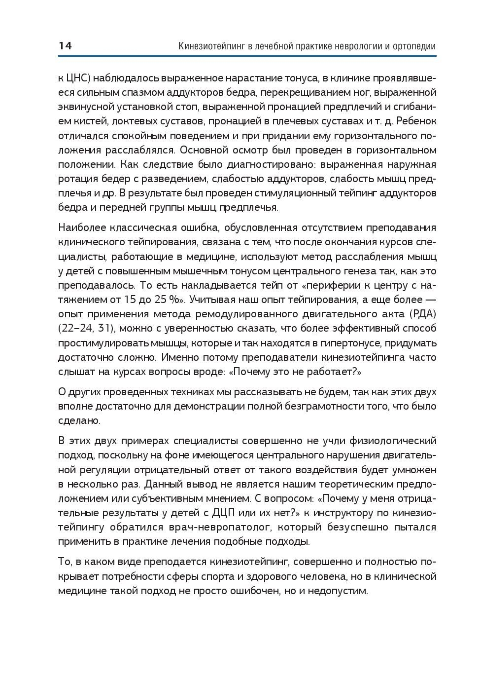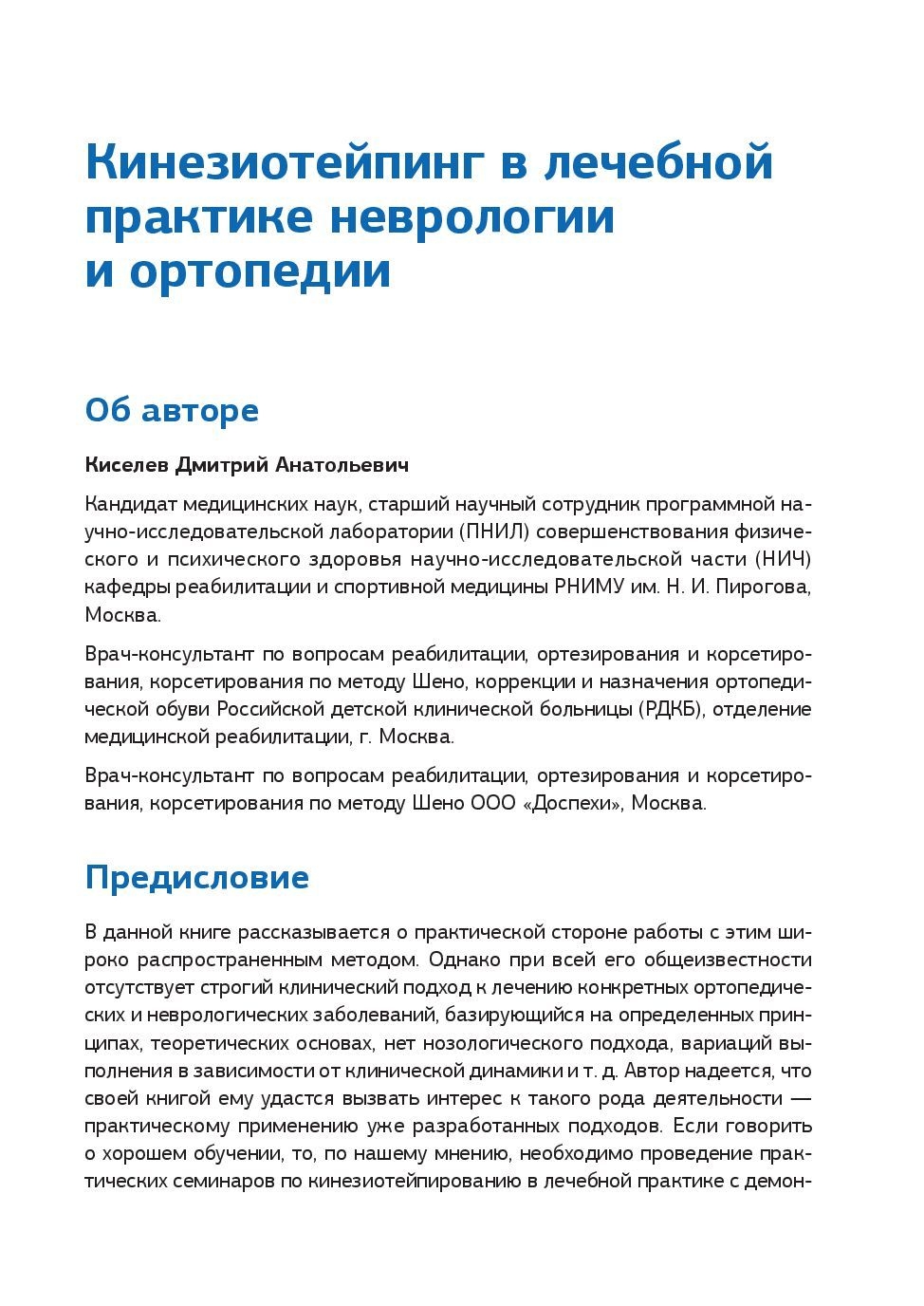 Книга посвящена применению метода кинезиотейпинга в лечебной работе с использованием теоретических и практических подходов, которые отсутствуют в практике мирового тейпирования. Реализация кинезиотейпинга на основе теории других реабилитационных методик, применяющихся в практике реабилитации на медицинской базе РНИМУ им. Н.И.Пирогова и РДКБ способствовала появлению и разработке совершенно иного методического подхода. Это явилось созданием практической и теоретической базы, аналогов которой найдено не было. Издание посвящено информационному представлению разработанных направлений тейпирования, максимально возможному показу вариантов реализации метода в ортопедии и неврологии. Средствами реализации является вся техническая база кинезиотейпинга, использование которой с предлагаемыми теоретическими подходами возможно на базе поликлиник, стационаров, санаториев, других лечебных учреждений, занимающихся лечением ортопедических и неврологических больных.