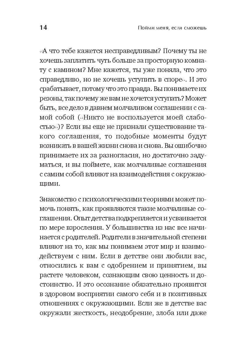 Часто что-то совершенно очевидное, не нуждающееся в объяснениии естественное для нас оказывается непонятным нашим близким. Если это происходит, вероятнее всего, в силу вступили "молчаливые соглашения". Именно так известные клинические психологи Линда Андерсон, Соня Бэнкс и Мишель Оуэн называют невысказанные ожидания, убеждения, правила отношений, которые мы не озвучиваем, считая, что они очевидны и понятны всем без слов. Эта книга поможет разобраться с тем, что действительно понятно большинству, а что необходимо проговорить, чтобы избежать недопонимания, какие слова подобрать и как сделать разговор о молчаливых соглашениях одновременно продуктивным и комфортным. Она научит освобождать любые отношения от груза недосказанности и станет незаменимой для всех, кто хочет слышать и быть услышанным, понимать и найти понимание.