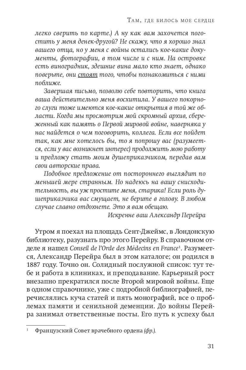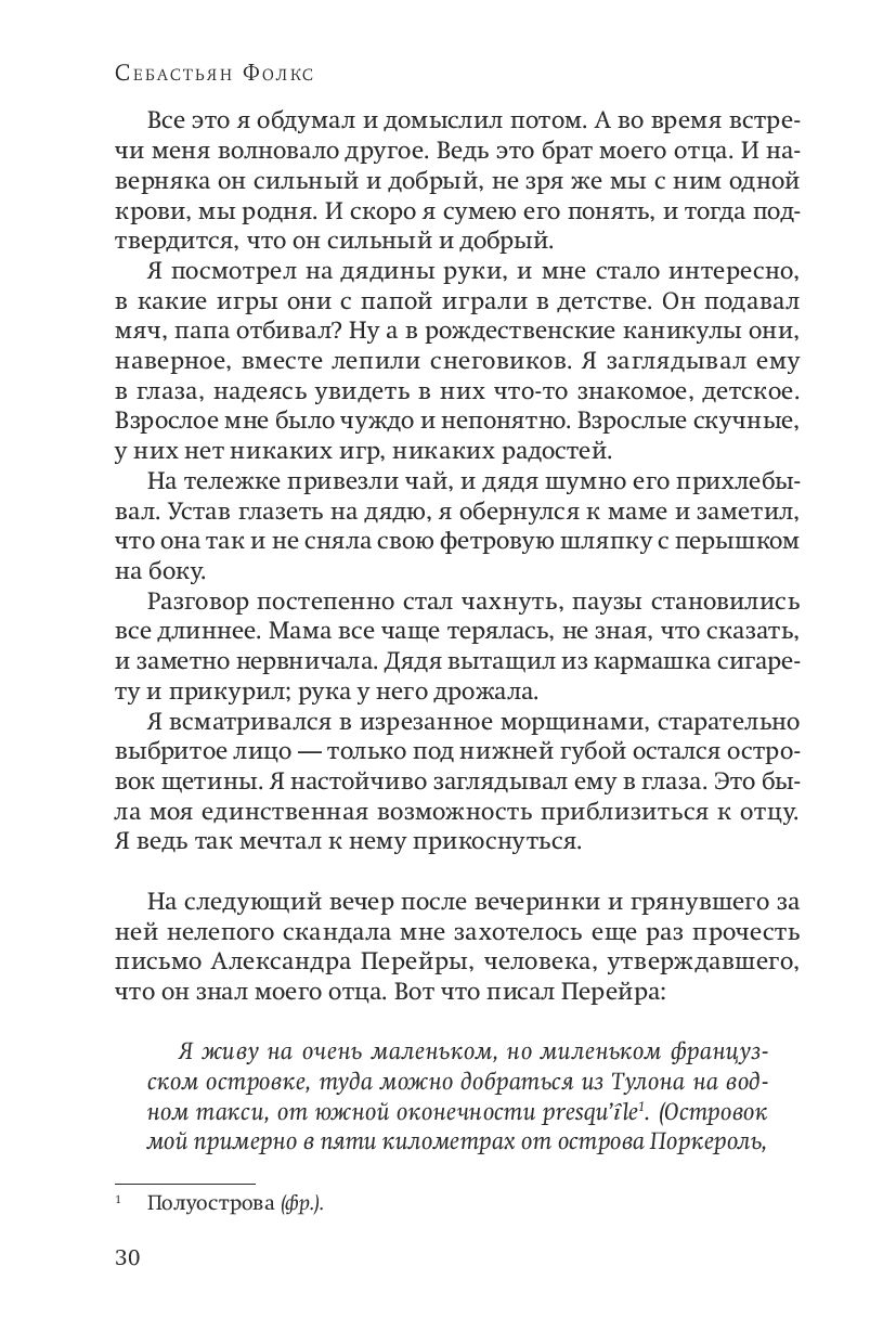 Как всегда у Фолкса, это плотная, образная, колдовская и музыкальная проза, достоверная психологически и честная экзистенциально. Это история жизни Роберта Хендрикса, успешного психиатра и писателя. Человек он малосимпатичный, циник (в особенности в отношениях с женщинами). Постепенно мы понимаем, что у Роберта не все так просто в жизни, как ему бы хотелось показать окружающим. Его отец погиб в Первую мировую, сам он – ветеран Второй, и его преследуют странные и мрачные наваждения – не то его собственные подавленные воспоминания, не то отцовский опыт. Однажды Роберту приходит приглашение от другого психиатра, престарелого Александра Перейры, посетить того на маленьком острове в Южной Франции. Перейра оказывается странным субъектом со своими скелетами в шкафу. От него Роберт наконец узнает об обстоятельствах гибели отца, и эти беседы приоткрывают для него вытесненное собственное прошлое, и в нем – прекрасную и трагическую историю любви.