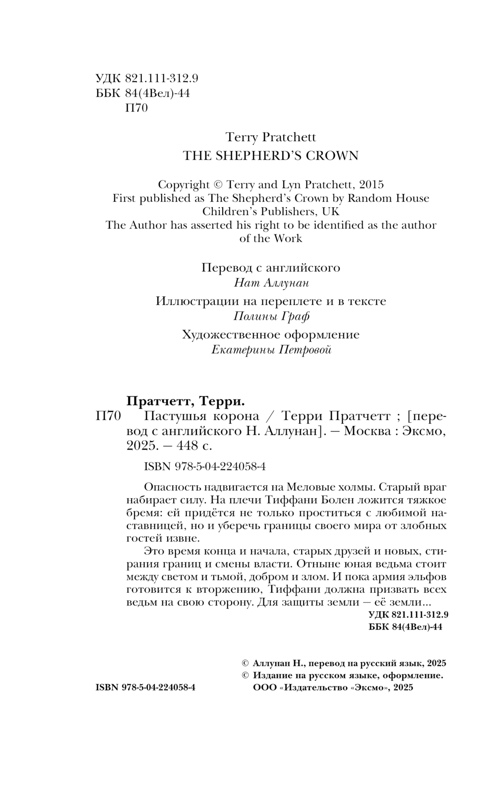 Это время конца и начала, старых друзей и новых, стирания границ и смены власти. Отныне юная ведьма стоит между светом и тьмой, добром и злом. И пока армия эльфов готовится к вторжению, Тиффани должна призвать всех ведьм на свою сторону. Для защиты земли – её земли…
