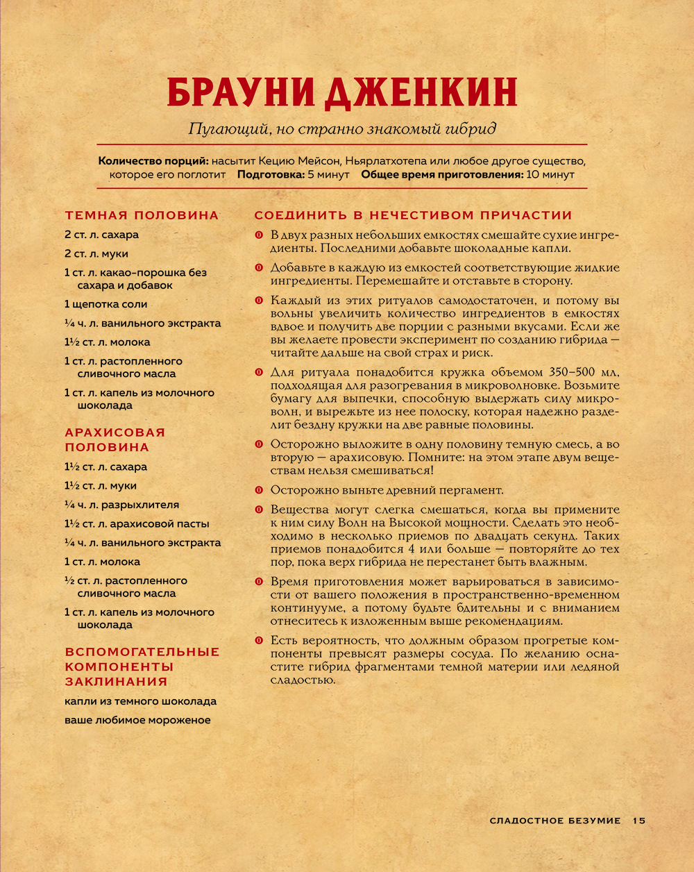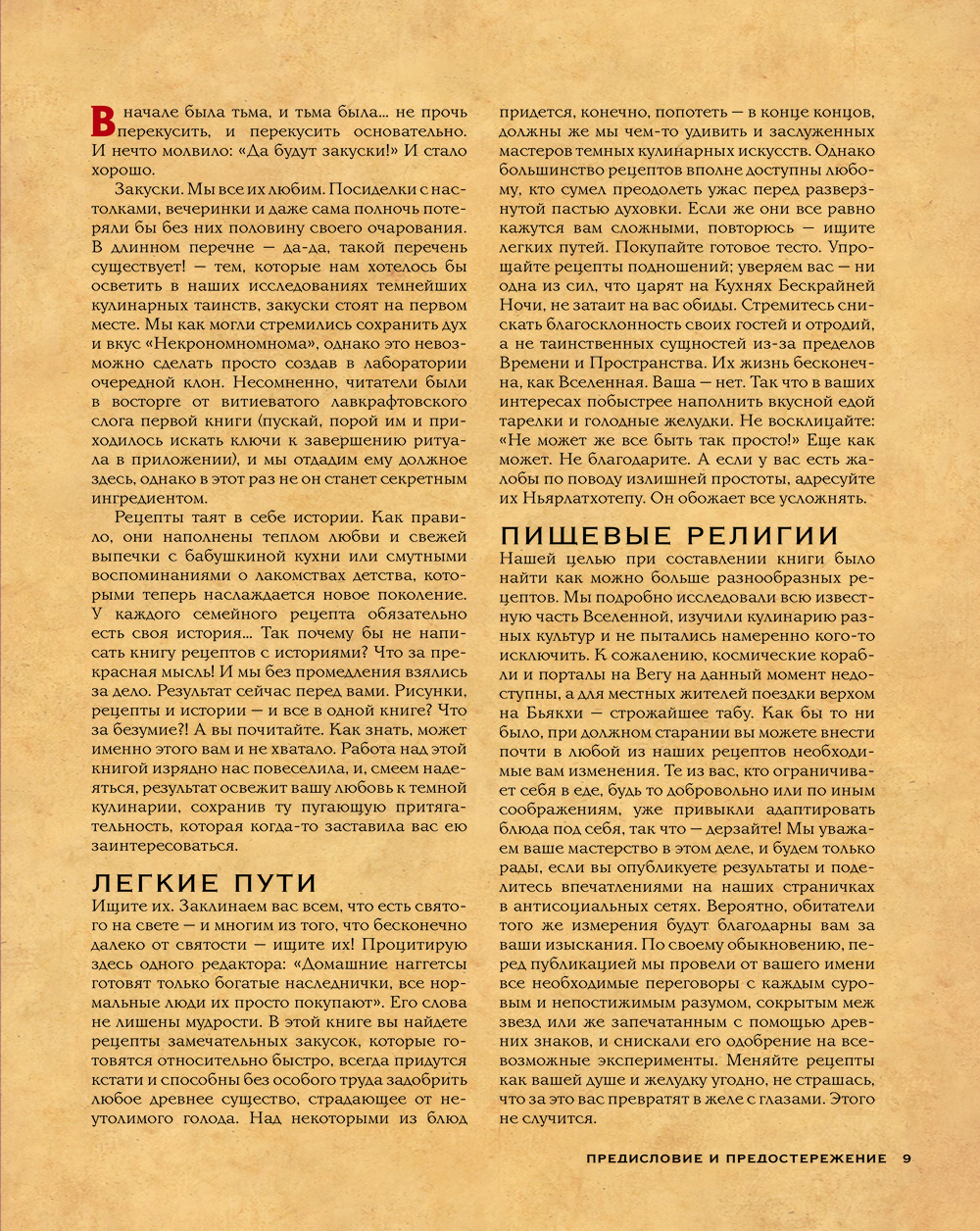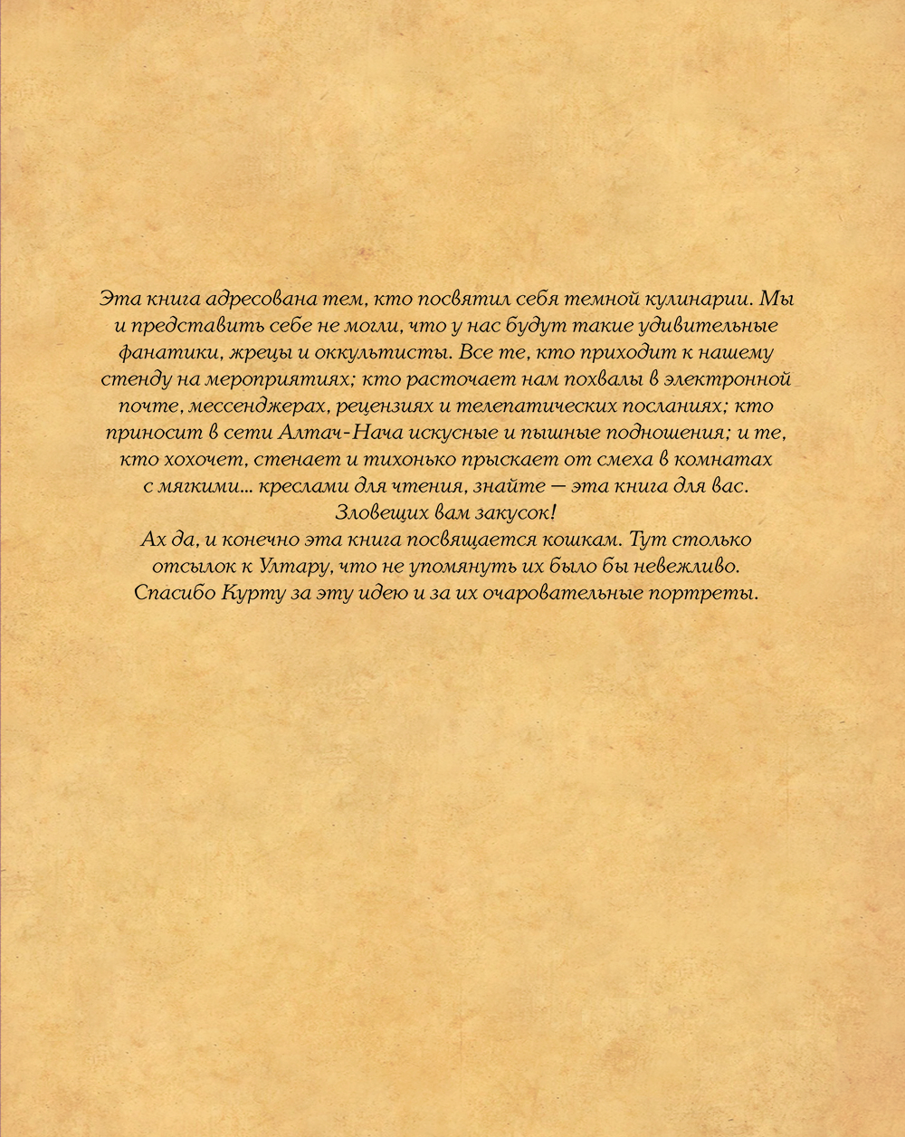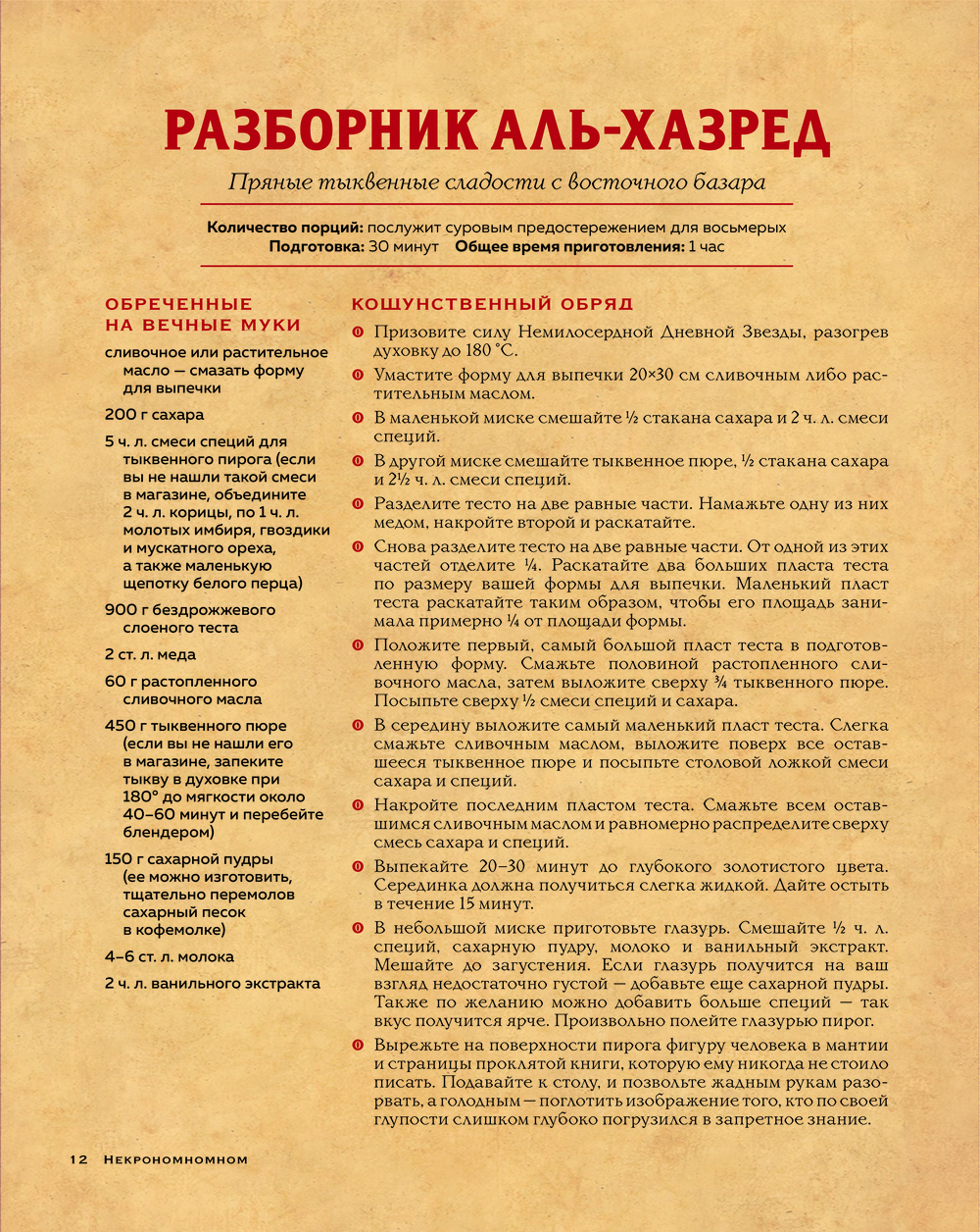Нырните в пучины холодного безумия с этим старым фолиантом, полным запретных знаний! Вдохновленная мрачной литературной вселенной Г.Ф. Лавкрафта, эта книга откроет вам путь к кулинарным ритуалам, где с помощью муки, пряностей и огня духовки можно призвать блюда из иных сфер, удовлетворить аппетиты Древних, а заодно и свои.