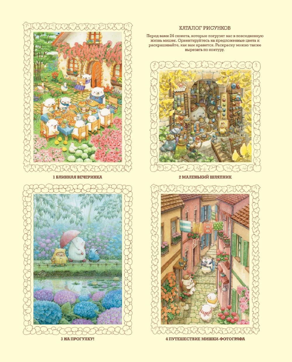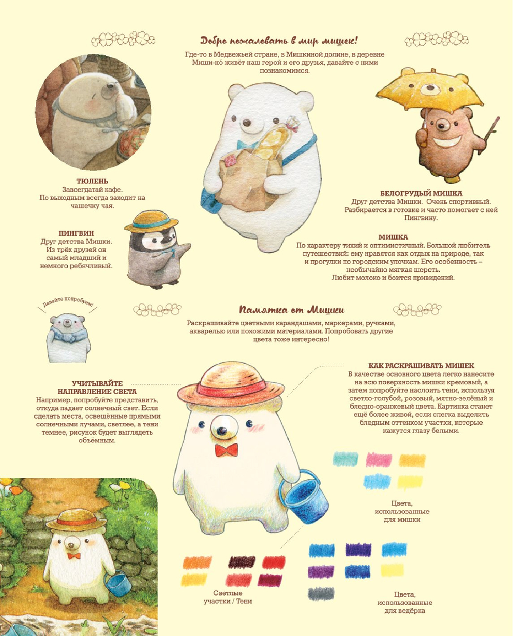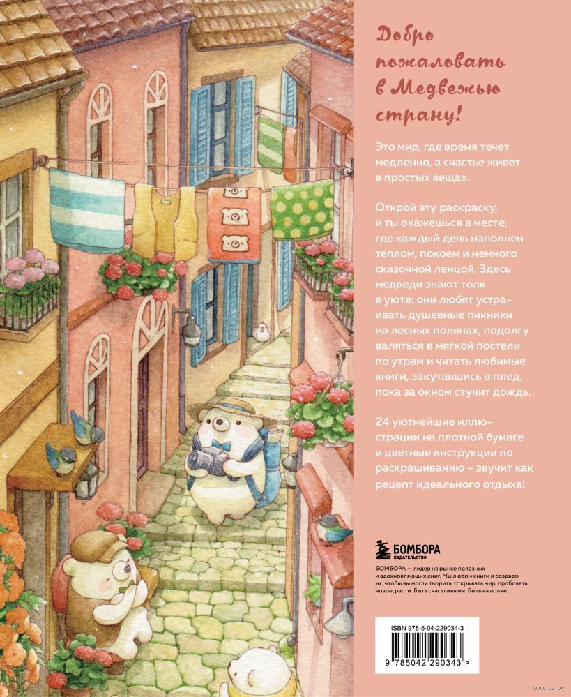 Внутри вы найдете 24 детальные иллюстрации и целое путешествие к мягким жителям уютной Медвежьей страны, которые познакомят вас с доброй и теплой сказкой через неспешный сюжет. Цветные инструкции по раскрашиванию станут как подспорьем в рисовании, так и интерактивным элементом: их можно вырезать и подарить как открытку.