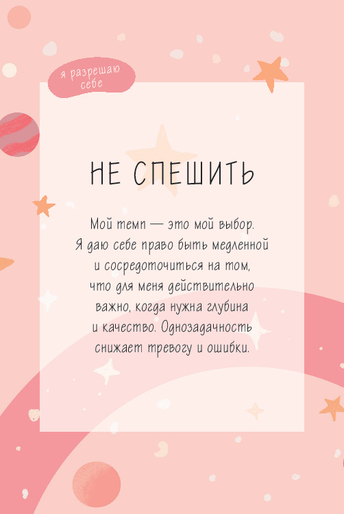 В самый загруженный день, когда список дел давит, а голова гудит от "надо успеть", она ныряет в сумку и находит маленькую колоду. Вытягивает карту. "Я разрешаю себе не спешить". Слова как будто скидывают с плеч лишний груз – можно замедлиться и выбрать один шаг, а не бежать марафон. Она делает вдох, откладывает телефон и допивает кофе без спешки. Днем, в промежутке между звонками, – еще одна карта: "Я разрешаю себе сказать "нет". Она перекладывает встречу на следующую неделю. И замечает, как внутри становится тише – свободное время возвращает силы. Вечером, когда усталость подкрадывается ближе, из колоды выпадает: "Я разрешаю себе отдыхать". Она не спорит с собой, не ищет оправданий, а просто готовит ужин, включает любимый сериал и позволяет себе лечь пораньше.