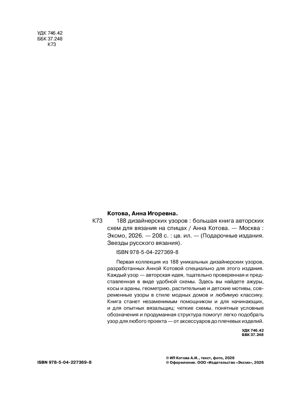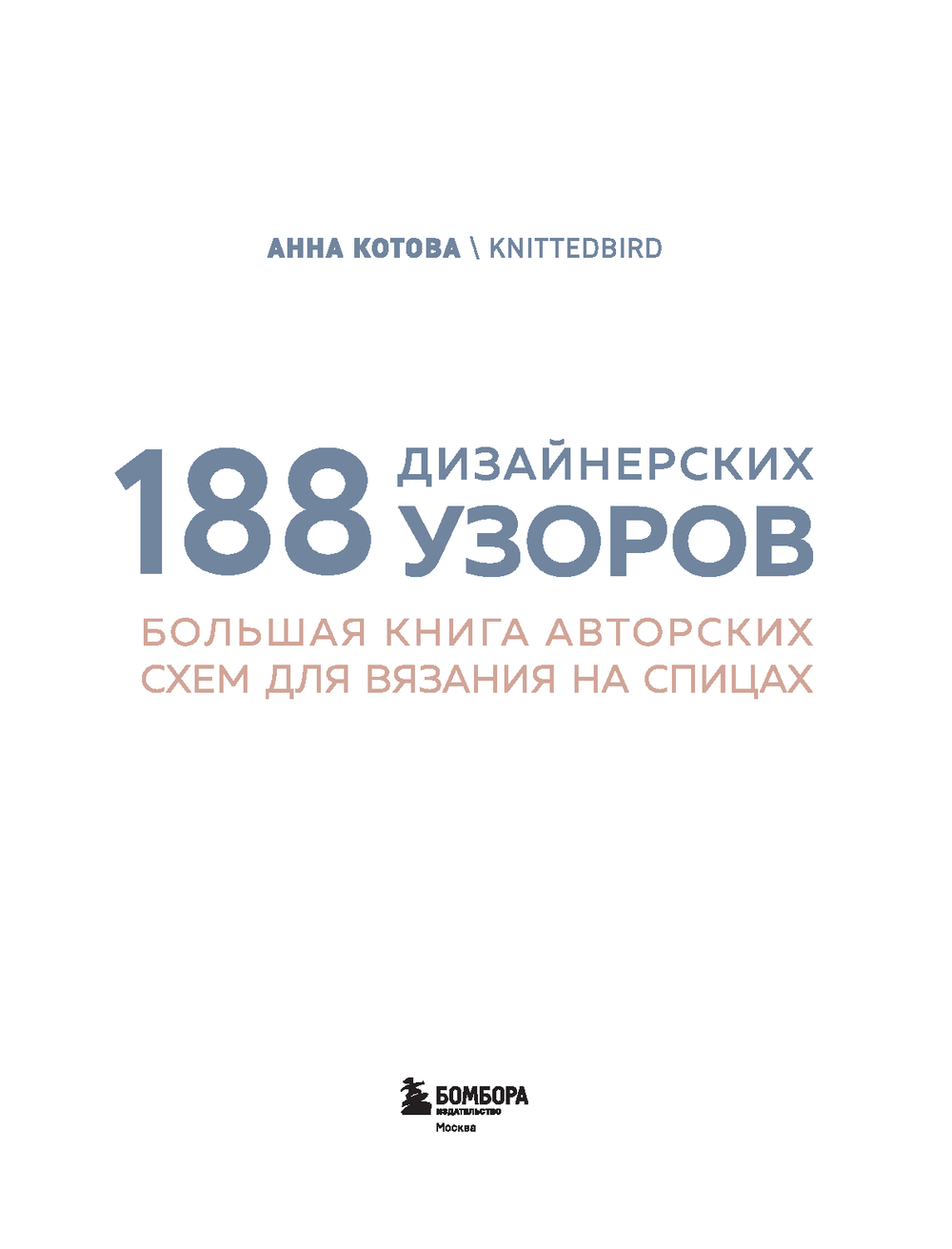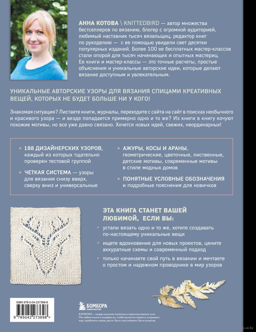 Первая коллекция из 188 уникальных дизайнерских узоров, разработанных Анной Котовой специально для этого издания. Каждый узор – авторская идея, тщательно проверенная и представленная в виде удобной схемы. Здесь вы найдете ажуры, косы и араны, геометрию, растительные и детские мотивы, современные узоры в стиле модных домов и любимую классику. Книга станет незаменимым помощником и для начинающих, и для опытных вязальщиц: четкие схемы, понятные условные обозначения и продуманная структура помогут легко подобрать узор для любого проекта – от аксессуаров до плечевых изделий.