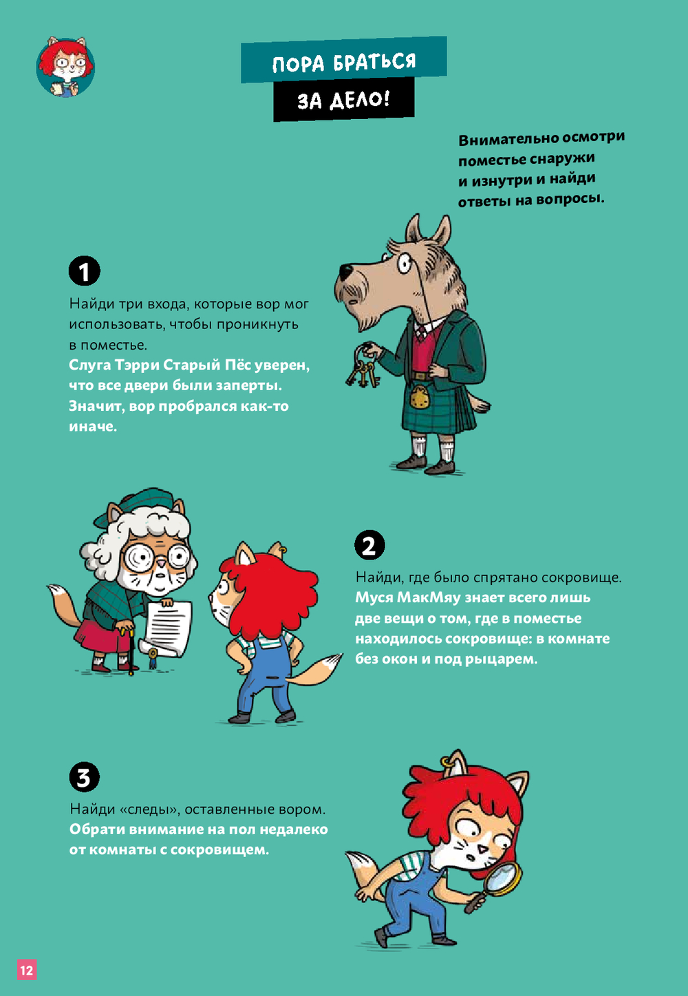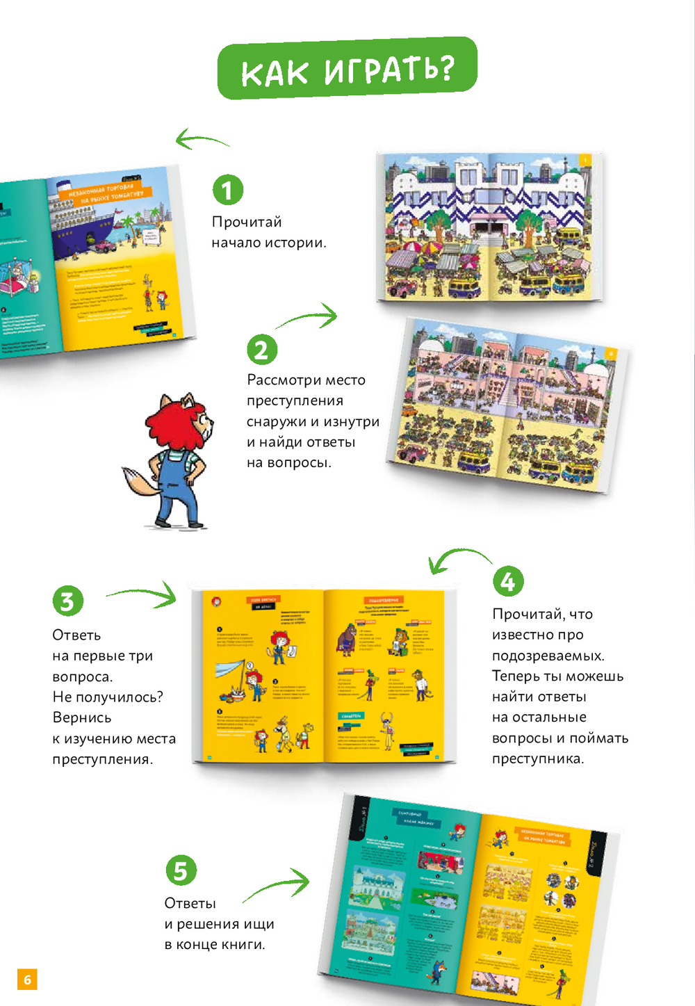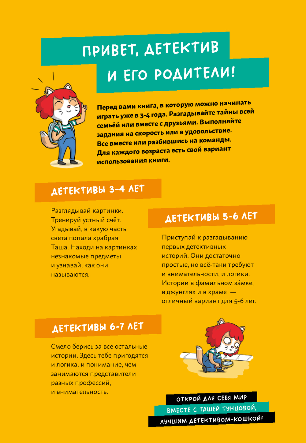 Маленьких детективов ждут 8 историй с заданиями, которые направлены на развитие внимания и умения строить логические цепочки. Сложность заданий растет с каждой историей, поэтому книга подойдет детям разных возрастов. Рассматривайте картинки и ищите на них улики с ребятами 3-4 лет. Разбирайтесь в первых детективных историях с детьми 5-6 лет. Распутывайте хитросплетения улик и показаний свидетелей вместе с ребятами 6-7 лет.