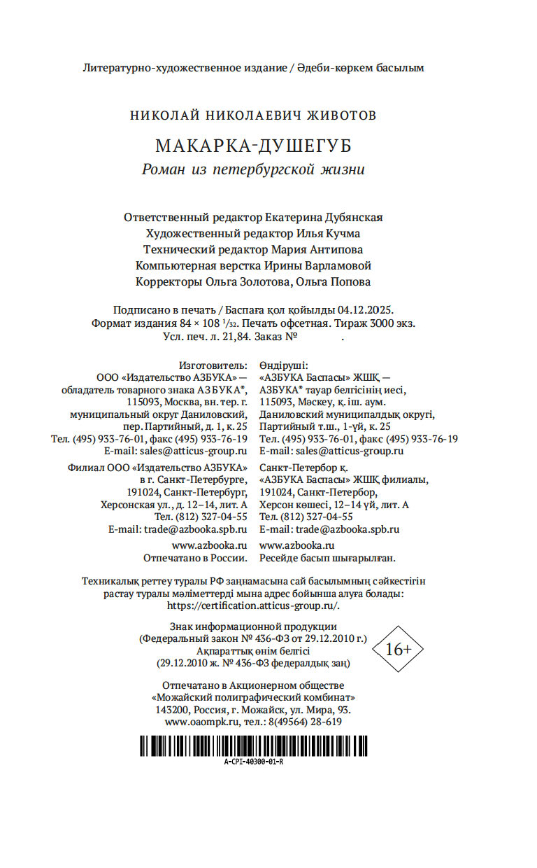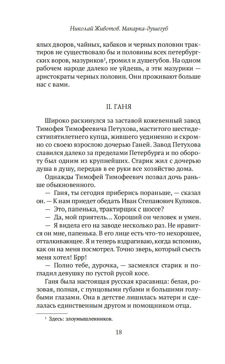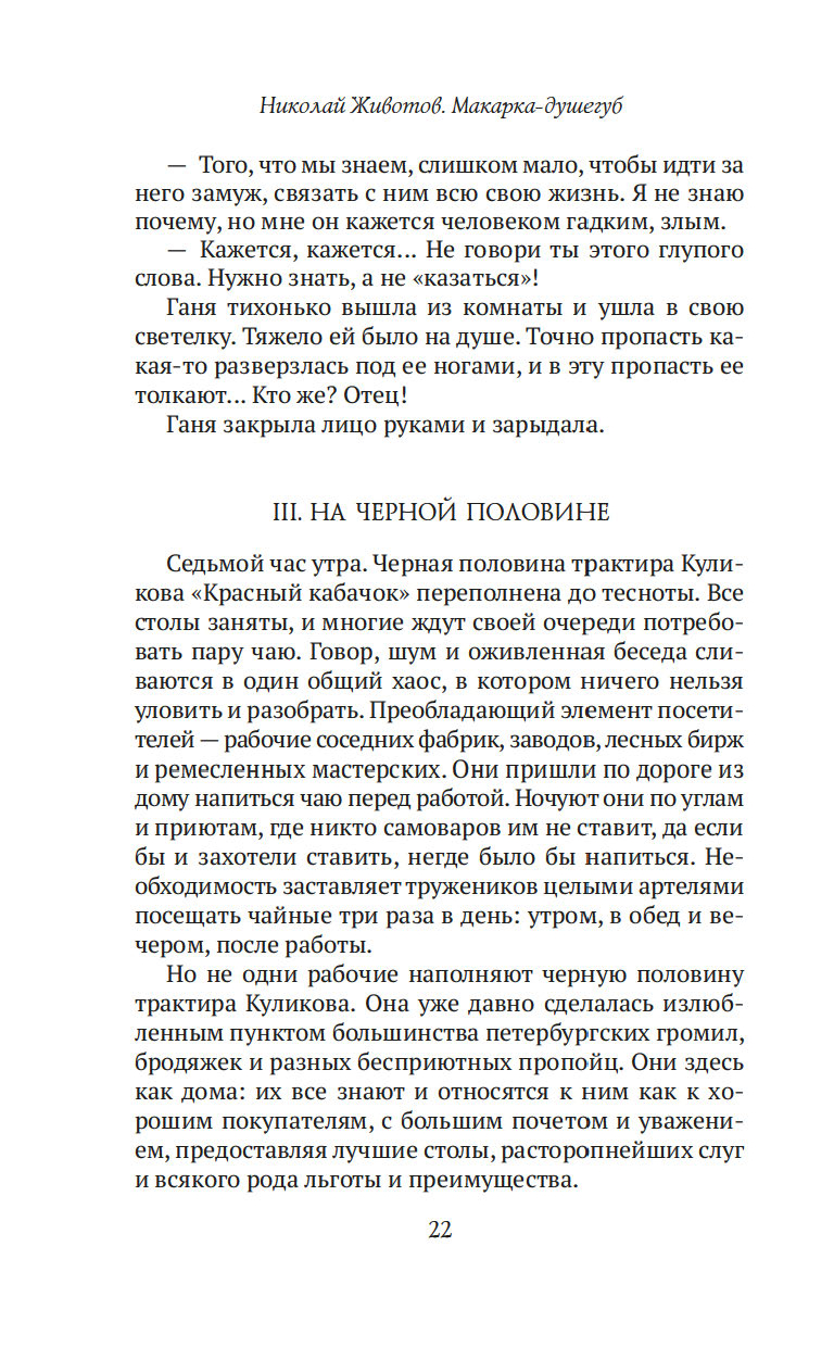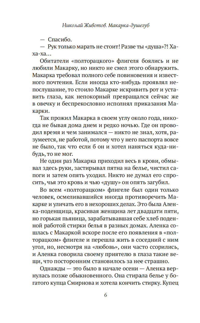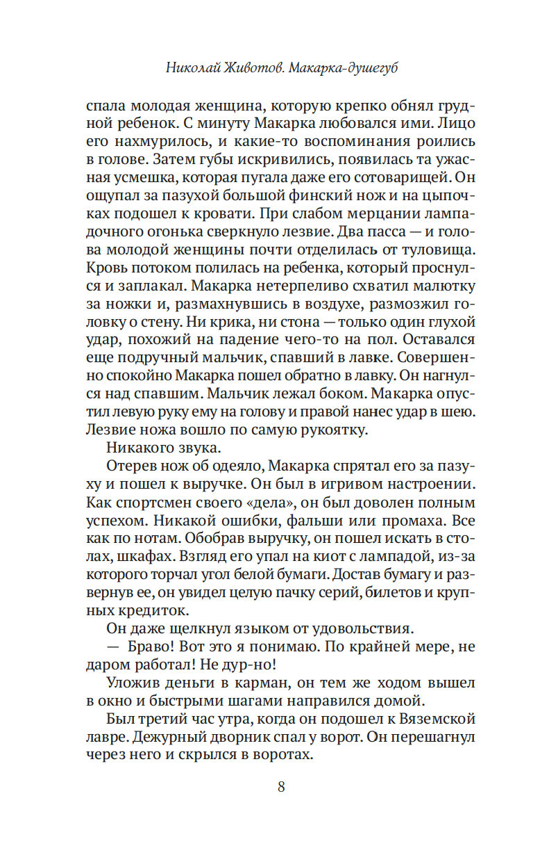 "Макарка-душегуб" – наиболее известное произведение Животова, которое, как и большинство его романов, основано на криминальных хрониках Петербурга и разворачивает перед читателем мрачноватую, но весьма колоритную изнанку столичной жизни последних лет империи.