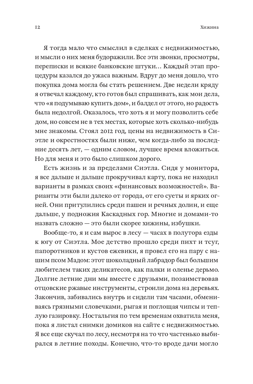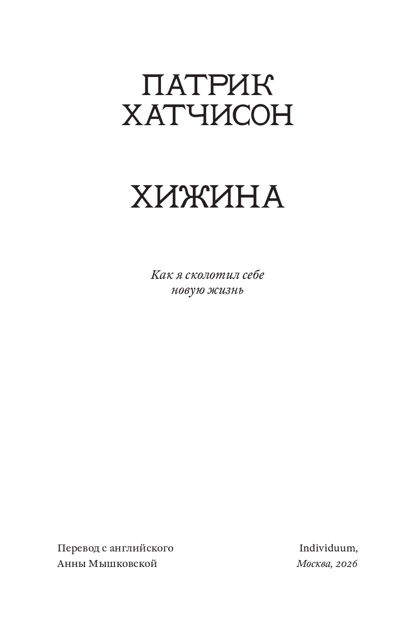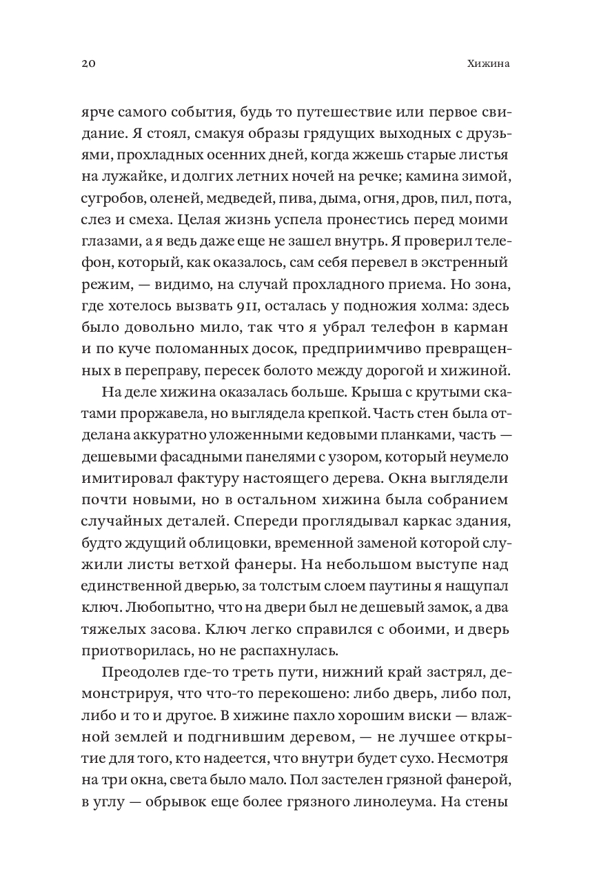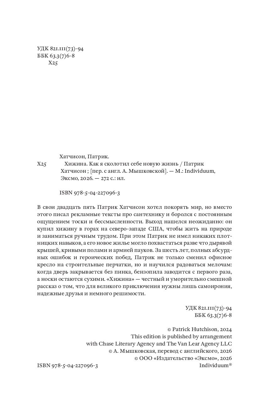 В свои двадцать пять Патрик Хатчисон хотел покорять мир, но вместо этого писал рекламные тексты про сантехнику и боролся с постоянным ощущением тоски и бессмысленности. Выход нашелся неожиданно: он купил хижину в горах на северо-западе США, чтобы жить на природе и заниматься ручным трудом. При этом Патрик не имел никаких плотницких навыков, а его новое жилье могло похвастаться разве что дырявой крышей, кривыми полами и армией пауков. За шесть лет, полных абсурдных ошибок и героических побед, Патрик не только сменил офисное кресло на строительные перчатки, но и научился радоваться мелочам: когда дверь закрывается без пинка, бензопила заводится с первого раза, а носки остаются сухими. "Хижина" – честный и уморительно смешной рассказ о том, что для великого приключения нужны лишь самоирония, надежные друзья и немного решимости.