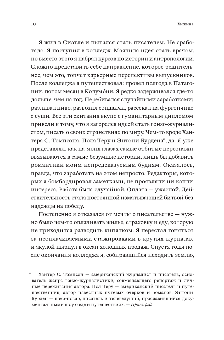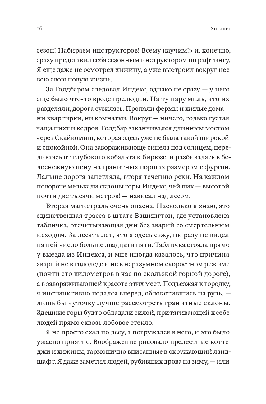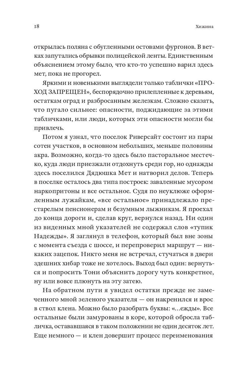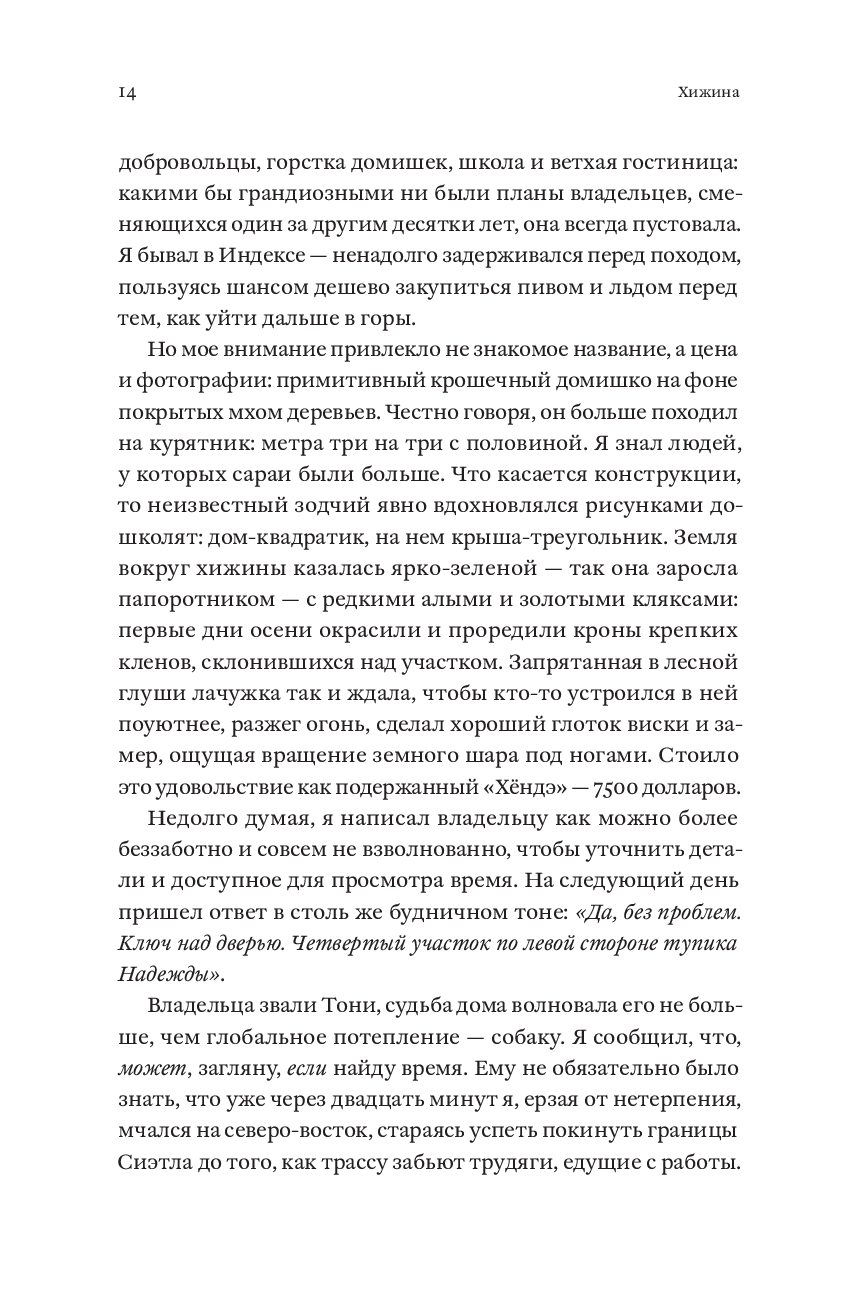 В свои двадцать пять Патрик Хатчисон хотел покорять мир, но вместо этого писал рекламные тексты про сантехнику и боролся с постоянным ощущением тоски и бессмысленности. Выход нашелся неожиданно: он купил хижину в горах на северо-западе США, чтобы жить на природе и заниматься ручным трудом. При этом Патрик не имел никаких плотницких навыков, а его новое жилье могло похвастаться разве что дырявой крышей, кривыми полами и армией пауков. За шесть лет, полных абсурдных ошибок и героических побед, Патрик не только сменил офисное кресло на строительные перчатки, но и научился радоваться мелочам: когда дверь закрывается без пинка, бензопила заводится с первого раза, а носки остаются сухими. "Хижина" – честный и уморительно смешной рассказ о том, что для великого приключения нужны лишь самоирония, надежные друзья и немного решимости.