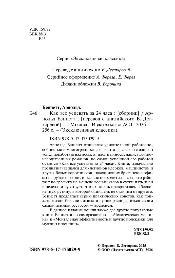 Арнольд Беннетт отличался удивительной работоспособностью и многогранностью таланта – за свою жизнь он успел поработать над всем, от пьес и киносценариев до производственных романов, но самой успешной его работой остается "Как все успевать за 24 часа". Книга, изначально предназначавшаяся для "легионов клерков, машинисток и других белых воротничков, наводнивших британские офисы на рубеже веков", идеально подходит для всех, кто работает по графику не меньше восьми часов в сутки пять дней в неделю и чувствует, что их жизнь превратилась в бесконечную рутину, в которой один день не отличим от другого. Беннетт предлагает серию практических советов, как придать жизни больше смысла и лучше распорядиться своим самым ценным ресурсом – временем.