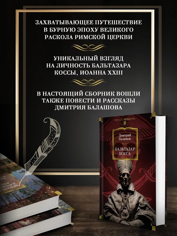 "Бальтазар Косса" – последний законченный роман писателя, филолога Дмитрия Михайловича Балашова, автора грандиозного цикла "Государи Московские". На сей раз приглашая читателей отправиться в бурную эпоху Великого раскола Римской церкви, Дмитрий Балашов предлагает свое видение личности Бальтазара Коссы, Иоанна XXIII, – то ли оклеветанного недоброжелателями, то ли в самом деле заслужившего свою мрачную славу.
