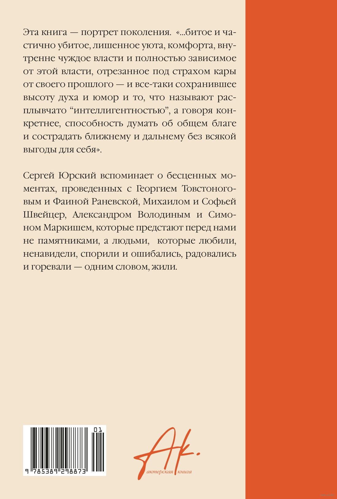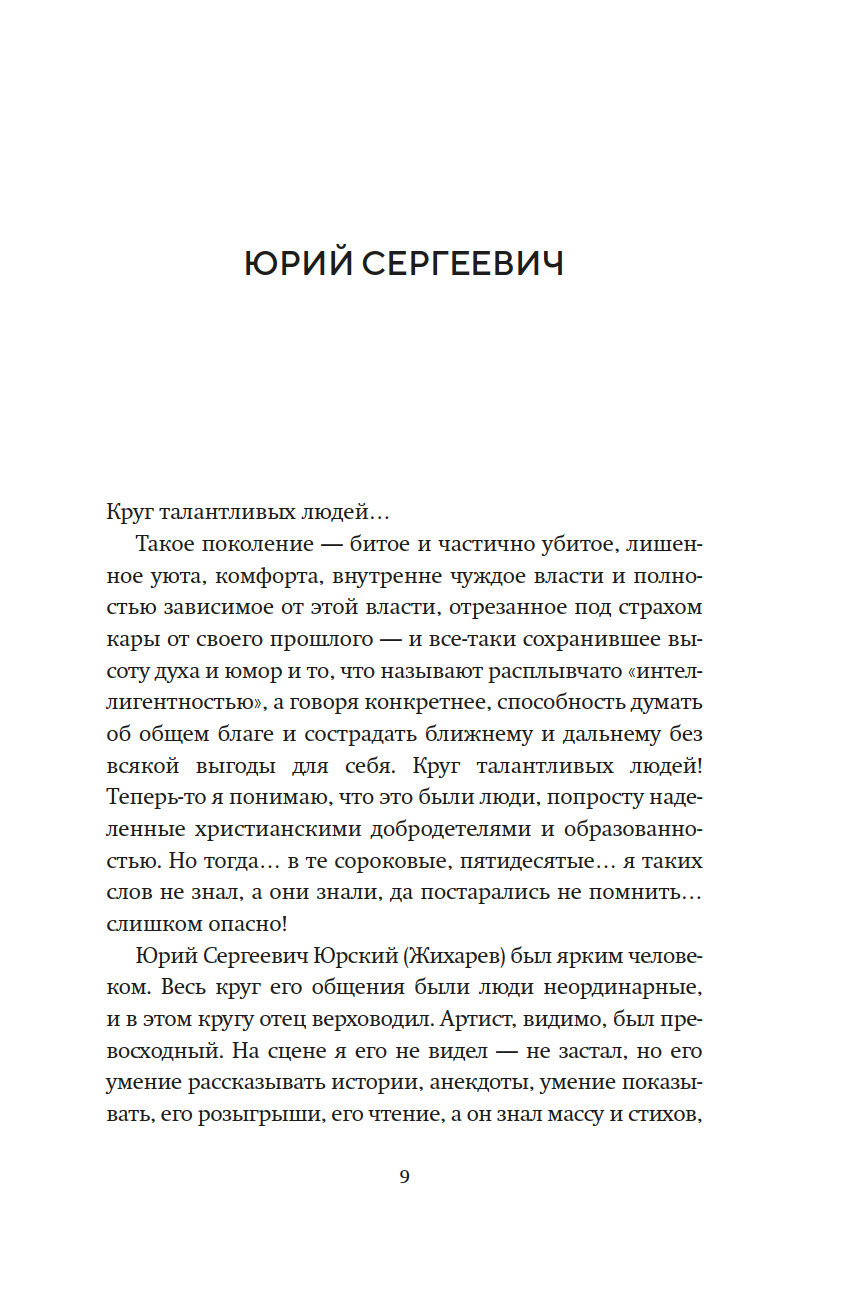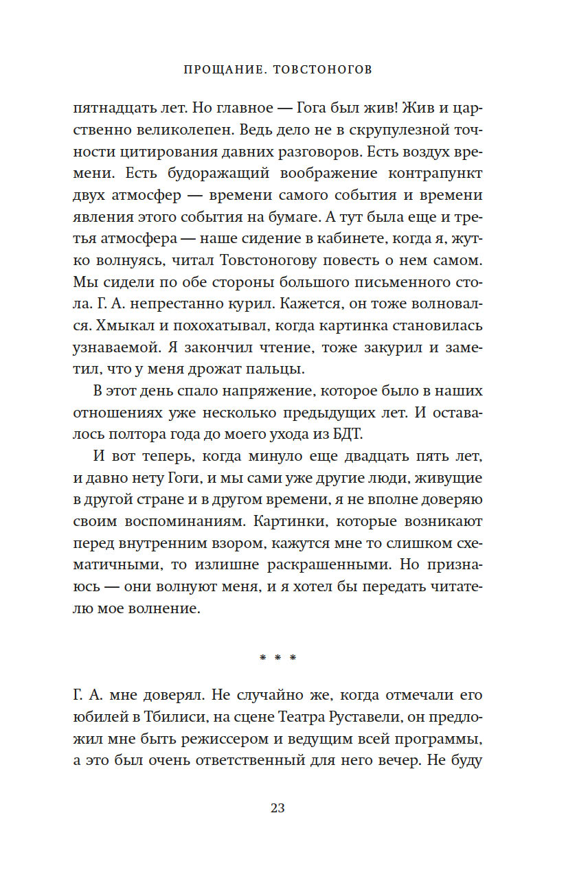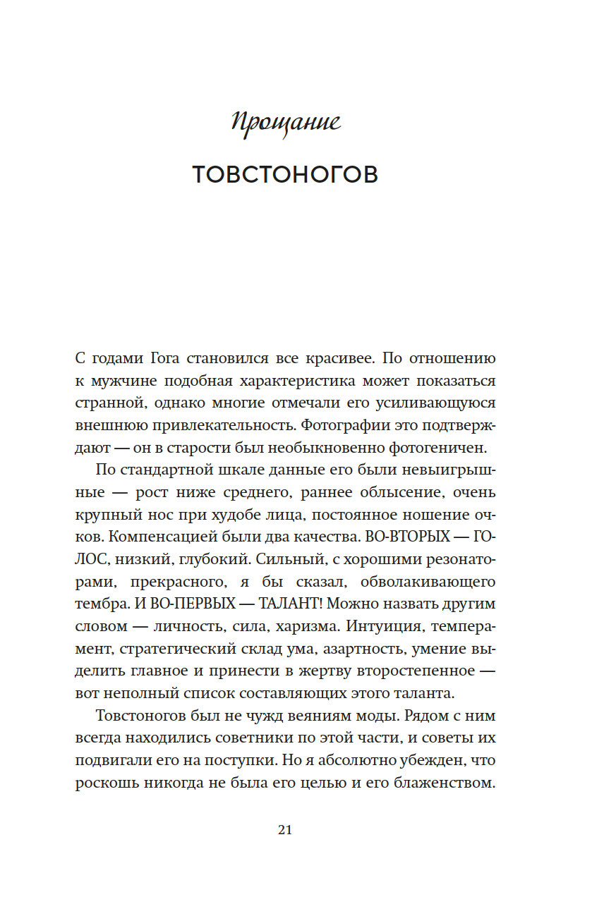 Сергей Юрский вспоминает о бесценных моментах, проведенных с Георгием Товстоноговым и Фаиной Раневской, Михаилом и Софьей Швейцерами, Александром Володиным и Симоном Маркишем, которые предстают перед нами не памятниками, а людьми, которые любили, ненавидели, спорили и ошибались, радовались и горевали – одним словом, жили.