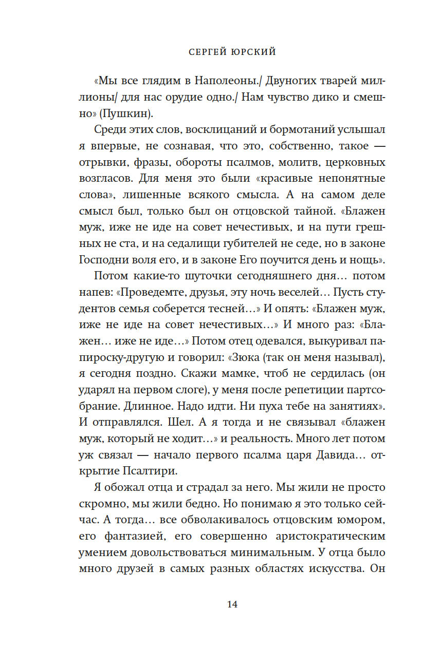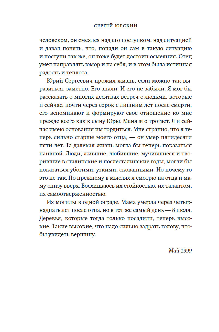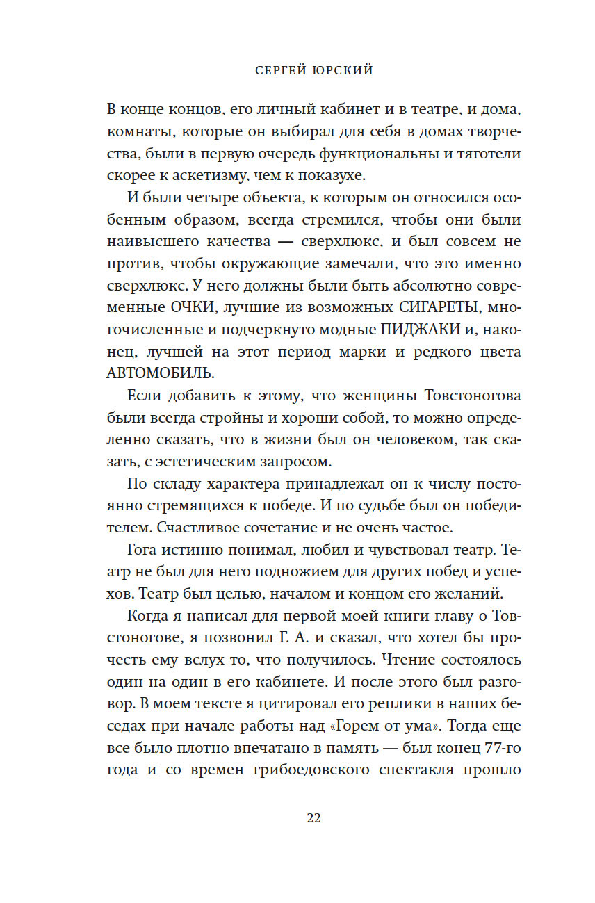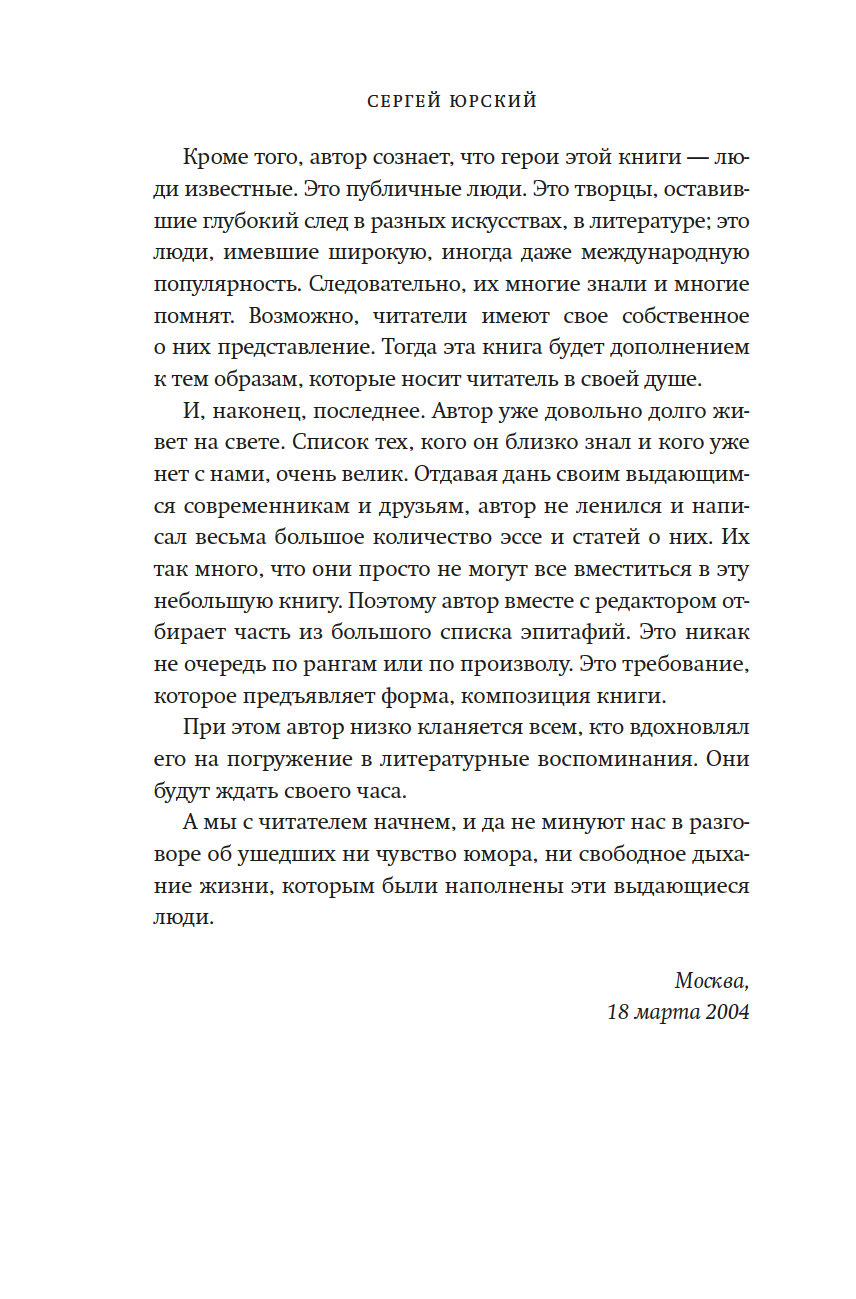 Сергей Юрский вспоминает о бесценных моментах, проведенных с Георгием Товстоноговым и Фаиной Раневской, Михаилом и Софьей Швейцерами, Александром Володиным и Симоном Маркишем, которые предстают перед нами не памятниками, а людьми, которые любили, ненавидели, спорили и ошибались, радовались и горевали – одним словом, жили.