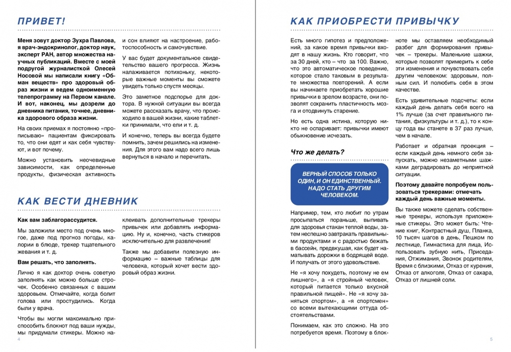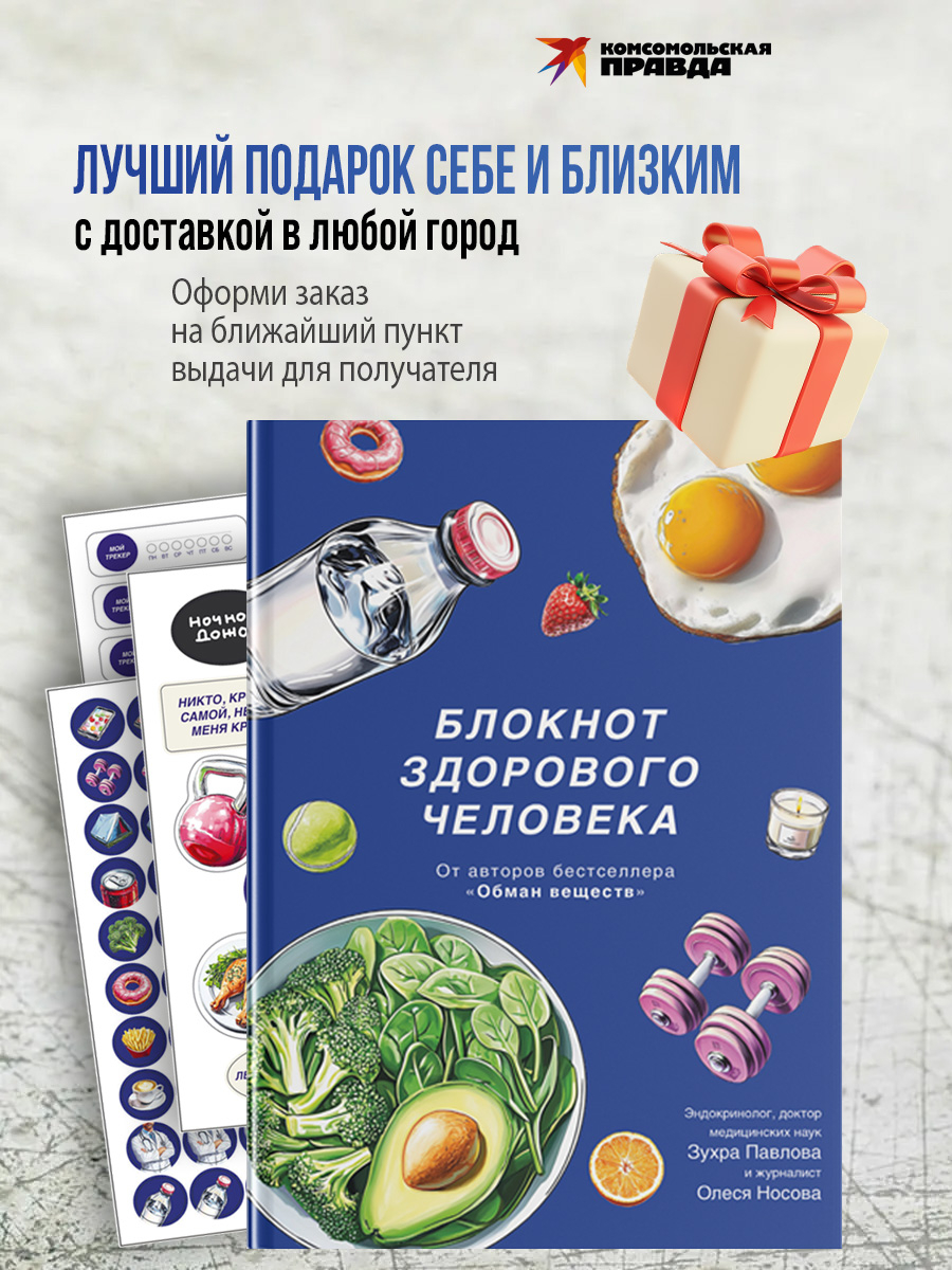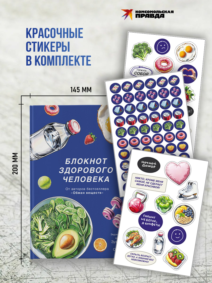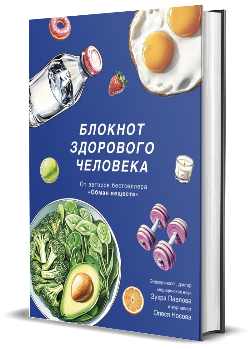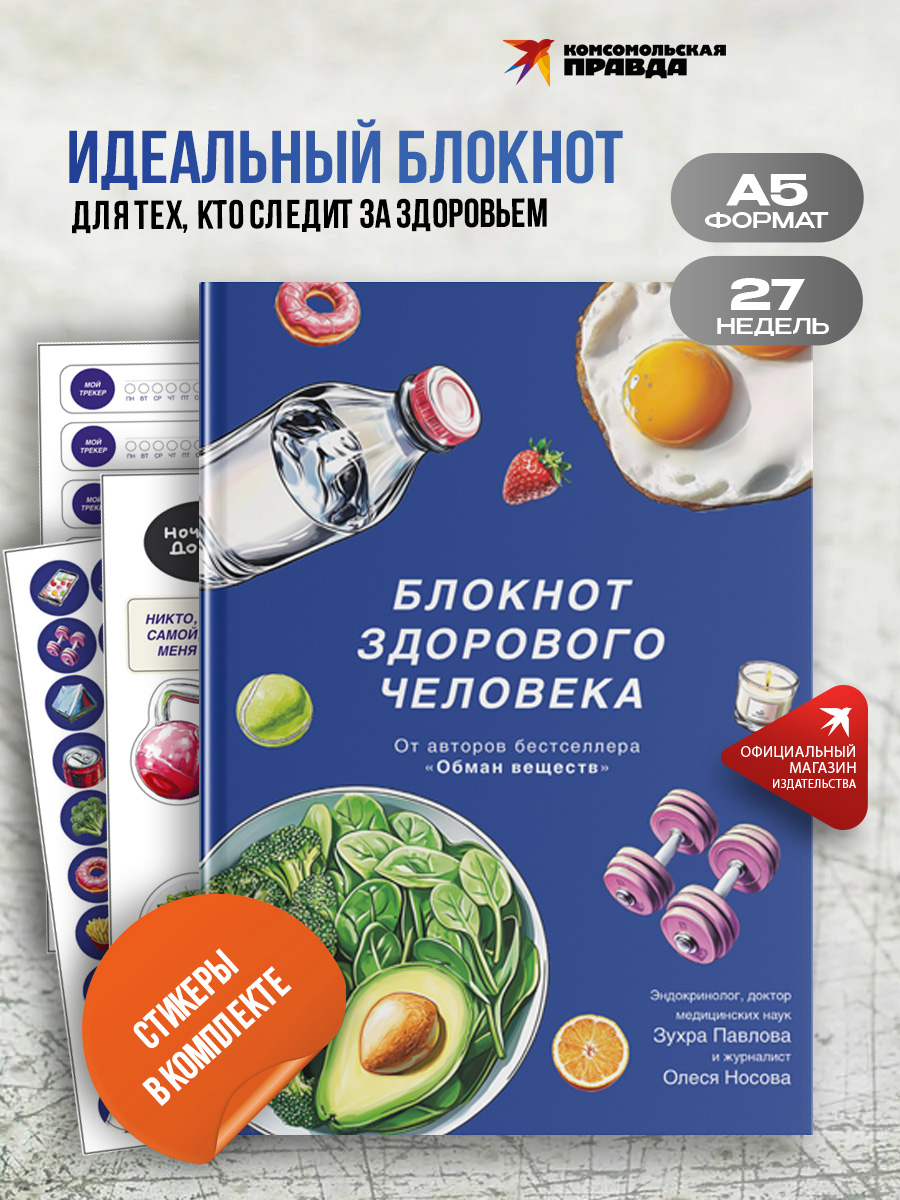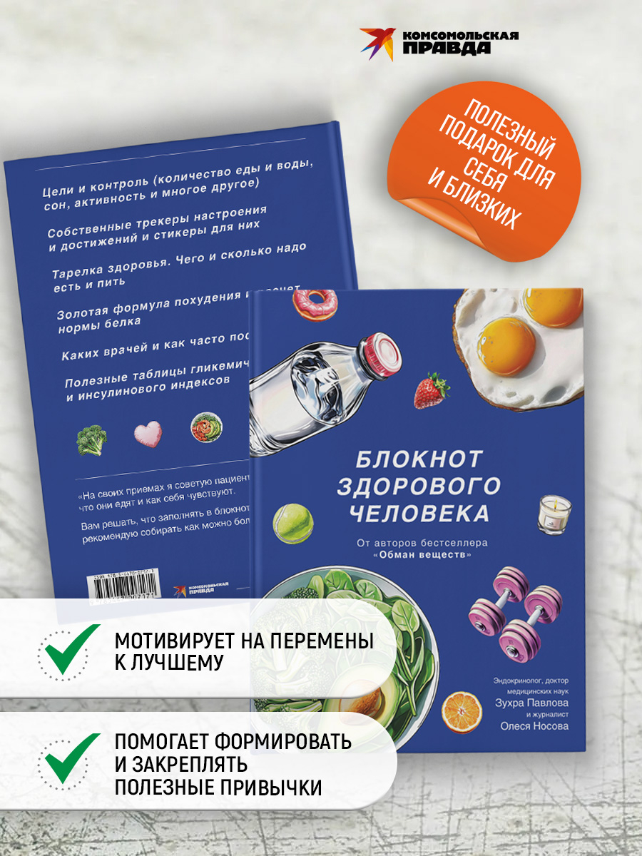 Дневник-блокнот для здорового образа жизни от соавторов абсолютного бестселлера "Обман веществ" – известного эндокринолога, доктора наук Зухры Павловой и журналиста, эксперта ЗОЖ Олеси Носовой. Под одной обложкой – трекеры для контроля питания, воды, сна, активности и многого другого. А также собственные трекеры для настроения и достижений и красочные стикеры для них. А еще наглядные таблицы с научными данными, которые помогут жить здорово и энергично, например таблица содержания конечных продуктов гликирования в еде и таблица сравнения гликемического и инсулинового индексов популярных продуктов.
