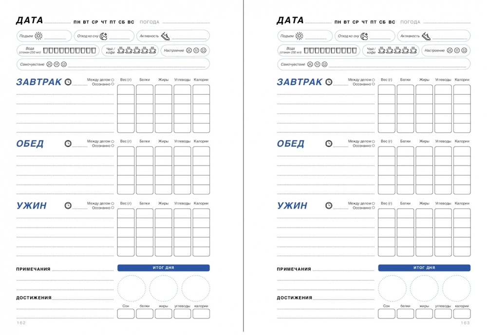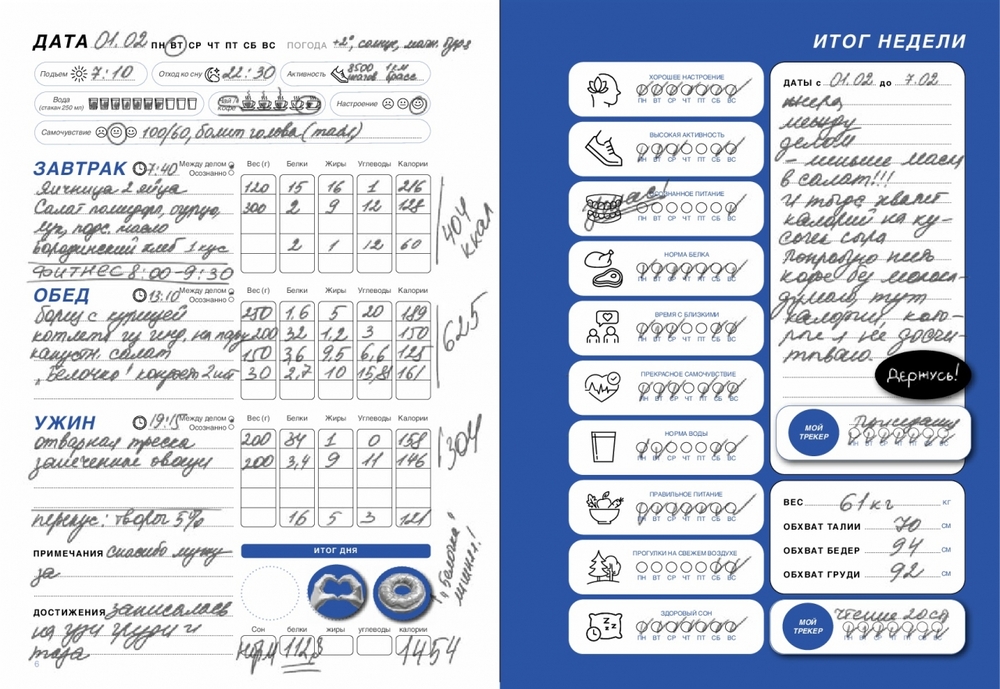 Всегда под рукой у вас будет тарелка правильного питания, список белковых продуктов и варианты приготовления полезных блюд. С блокнотом ваш путь к здоровому образу жизни будет точно красивее и легче. Заведите еще одну хорошую привычку – заполнять блокнот как можно чаще и подробнее, фиксируя все оттенки самочувствия. Так можно установить неочевидные зависимости, как определенные продукты, физическая активность и сон влияют на настроение, работоспособность и самочувствие и при необходимости обсудить всё это с врачом.