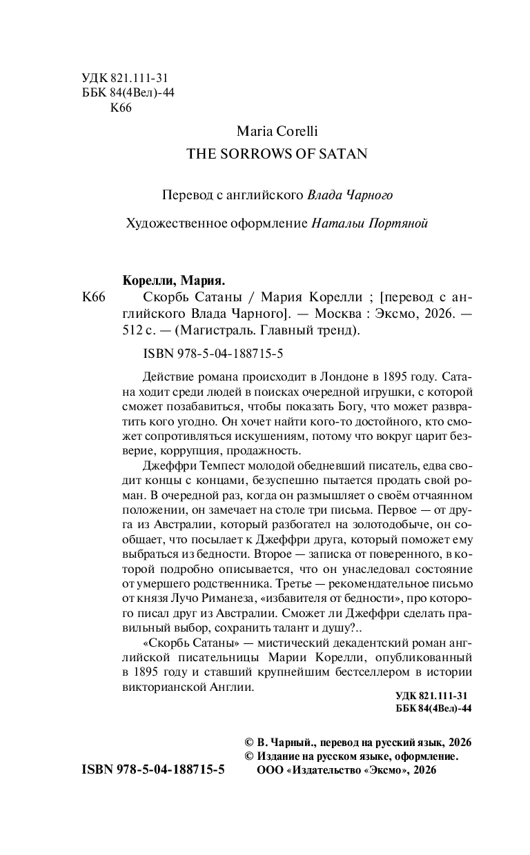 В комплект входят 2 книги из религиозной трилогии Марии Корелли: "Варавва" (1893) и "Скорбь сатаны" (1895). Третья часть "Учитель-христианин" будет впервые переведена на русский язык и добавлена к комплекту осенью 2026 г.